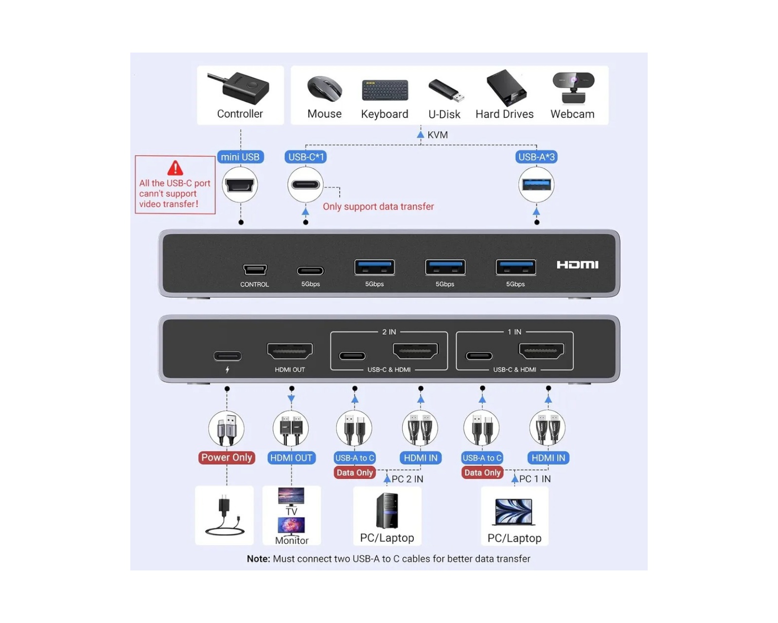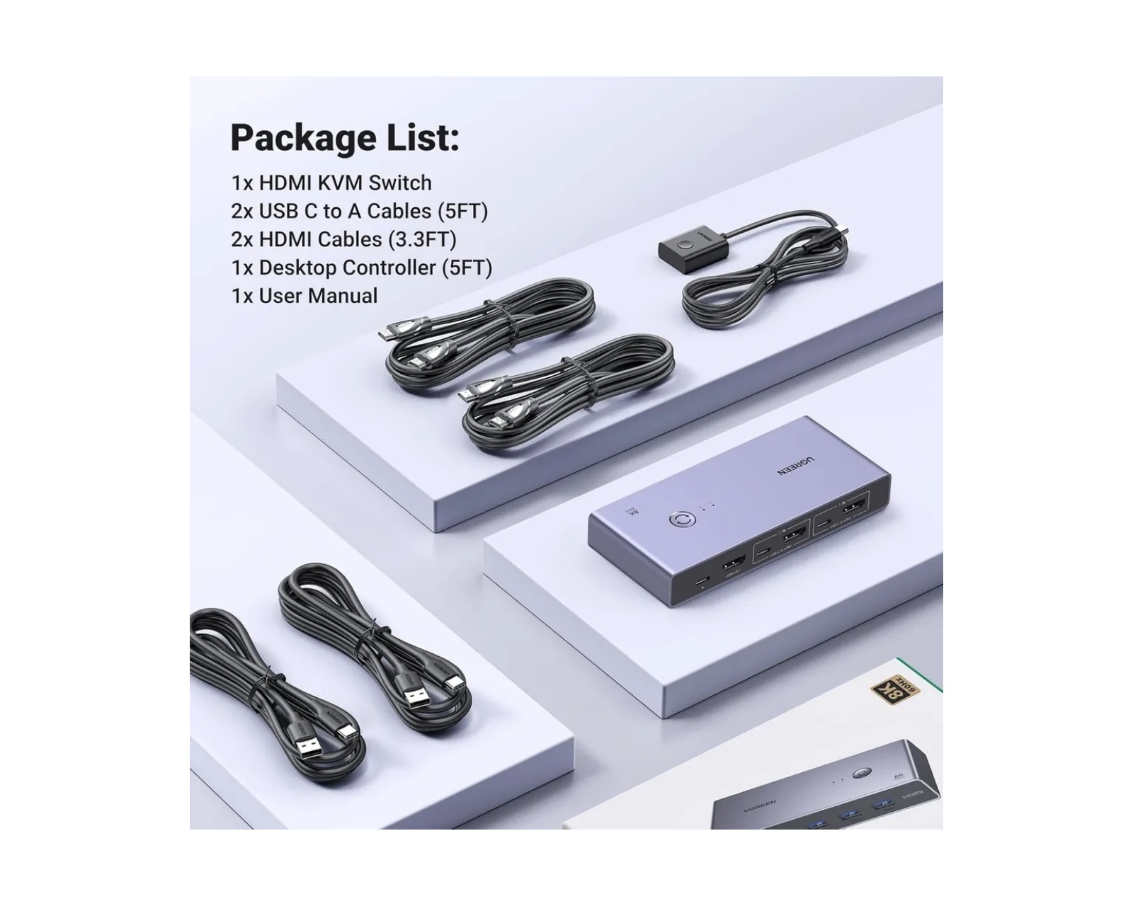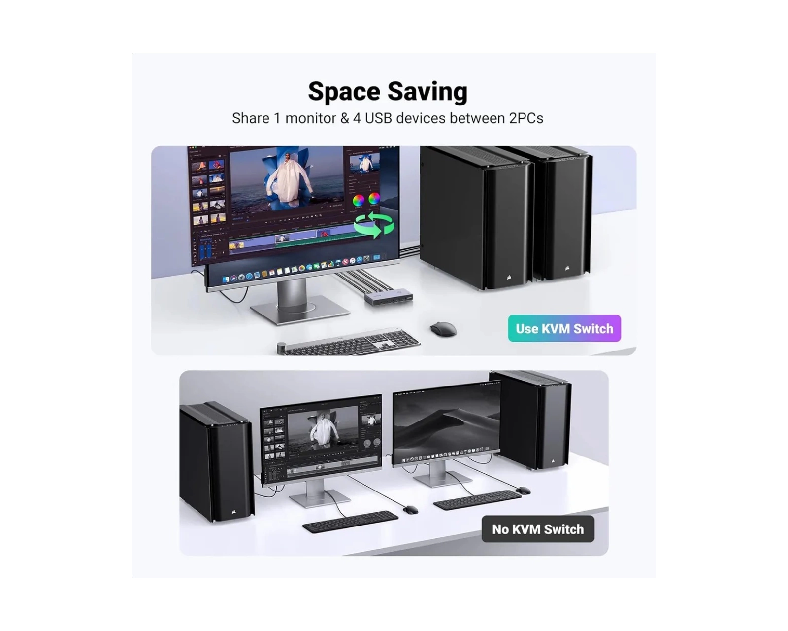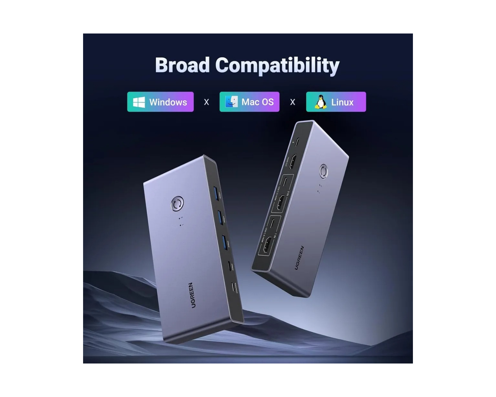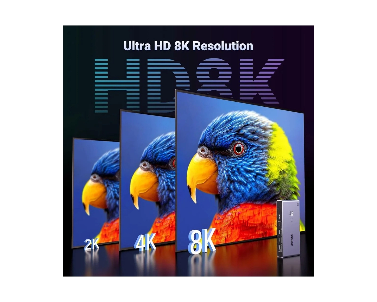 8K HDMI KVM-kytkin on UGREENin laite, joka mahdollistaa yhden näytön ja neljän USB 3.0 -laitteen jakamisen kahden tietokoneen välillä. Tämä kytkin mahdollistaa kahden tietokoneen keskitetyn hallinnan yhden näytön kautta, mikä edistää järjestelmällisempää työtilaa ja optimoi tuottavuutta. Tukemalla jopa 8K@60Hz:n resoluutiota se varmistaa, että kaikki visuaaliset yksityiskohdat säilyvät käytön aikana. KVM-kytkin on suunniteltu tukemaan HDMI 2.1:tä ja on taaksepäin yhteensopiva useiden resoluutioiden kanssa, mukaan lukien 4K@60Hz ja 1920*1080@240Hz.Kytkimessä on ominaisuuksia, kuten HDCP 2.3/1.4, ja se tarjoaa kolme kertaa suuremman siirtonopeuden Ultra HD 4K:hon verrattuna, mikä poistaa nykimisen tai jumiutumisen videotoiston aikana. Kytkimen rakenne mahdollistaa nopean yhteyden ilman ajureita ja se on yhteensopiva useiden käyttöjärjestelmien kanssa, mikä tekee siitä hyödyllisen useissa eri tilanteissa, kuten toimistoissa, pelihuoneissa ja multimediaesityksissä.