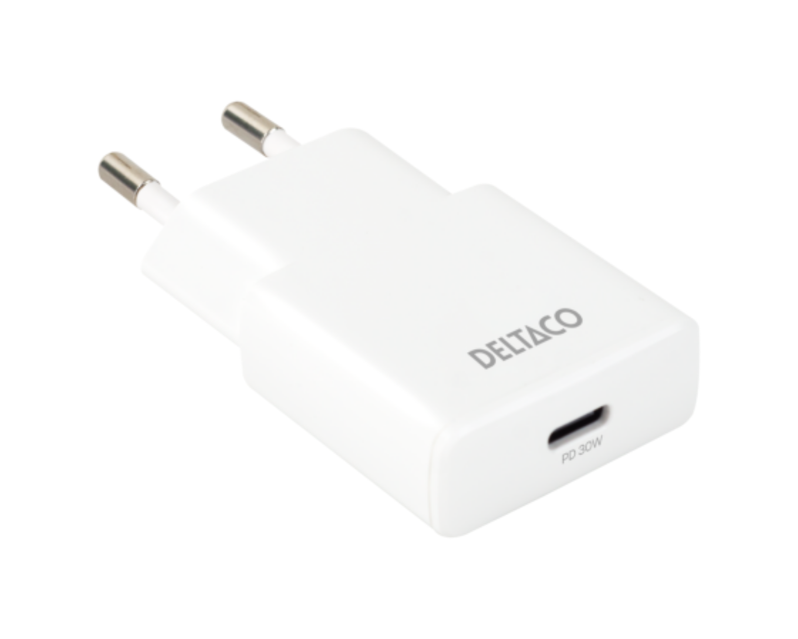 30W USB-C SeinäladAttaja on Deltacon ohut seinälataaja. Siinä on USB-C PD -portti, jonka maksimi teho on 30 W ja tuki PPS-lataukselle, mikä mahdollistaa virran ja jännitteen säätämisen tehokkaampaa lataamista varten yhteensopiville laitteille. Ohut muotoilu tekee siitä ihanteellisen matkustamiseen ja sen tehokkuus tekee siitä sopivan älypuhelimille, tableteille ja pienille kannettaville tietokoneille.USB-C seinälataaja yhdistää Power Delivery -teknologian ja PPS:n (Programmable Power Supply), mikä tarkoittaa, että se päivittää jatkuvasti lataustilaa ja säätää virtaa sekä jännitettä. Siinä on useita ulostulotasoja: 5 V / 3 A, 9 V / 3 A, 12 V / 2.5 A, 15 V / 2 A ja 20 V / 1.5 A, mikä tarjoaa suuren joustavuuden erilaisten laitteiden lataamiseen. Kun sitä käytetään 110 V -pistorasiassa, maksimiteho on 20 W. Laite on kehitetty minimoimaan lämpökehitys lataamisen aikana, mikä auttaa pidentämään ladattavien laitteiden akun käyttöikää.