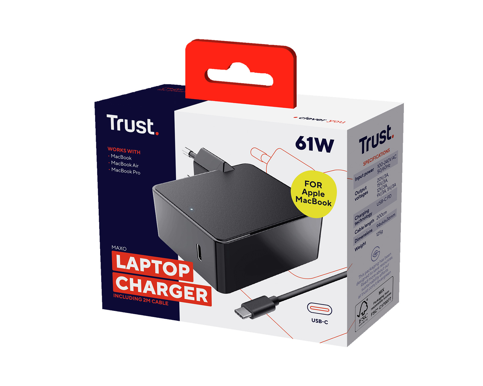 Täydellinen työhön, matkoille tai työmatkoille, energiatehokas muotoilu takaa pitkäkestoisen kestävyyden, joten Trust Maxo 61W on täydellinen latauskumppani MacBookeille ja muille USB-C-laitteille.