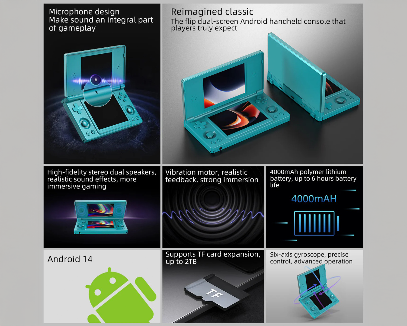 RK3568-prosessori ja 3 GB RAM tarjoavat sulavaa emulaatiota kuten PS1 ja N64. Laitteessa on tukeva clamshell-muotoilu ja se sisältää muun muassa hallintantunnistimia ja gyroskoopin. Tallennustilaa on 32 GB sisäisesti, ja se tukee ulkoista tallennusta microSD:llä jopa 2 TB, mikä tarjoaa runsaasti tilaa peleille ja sovelluksille.