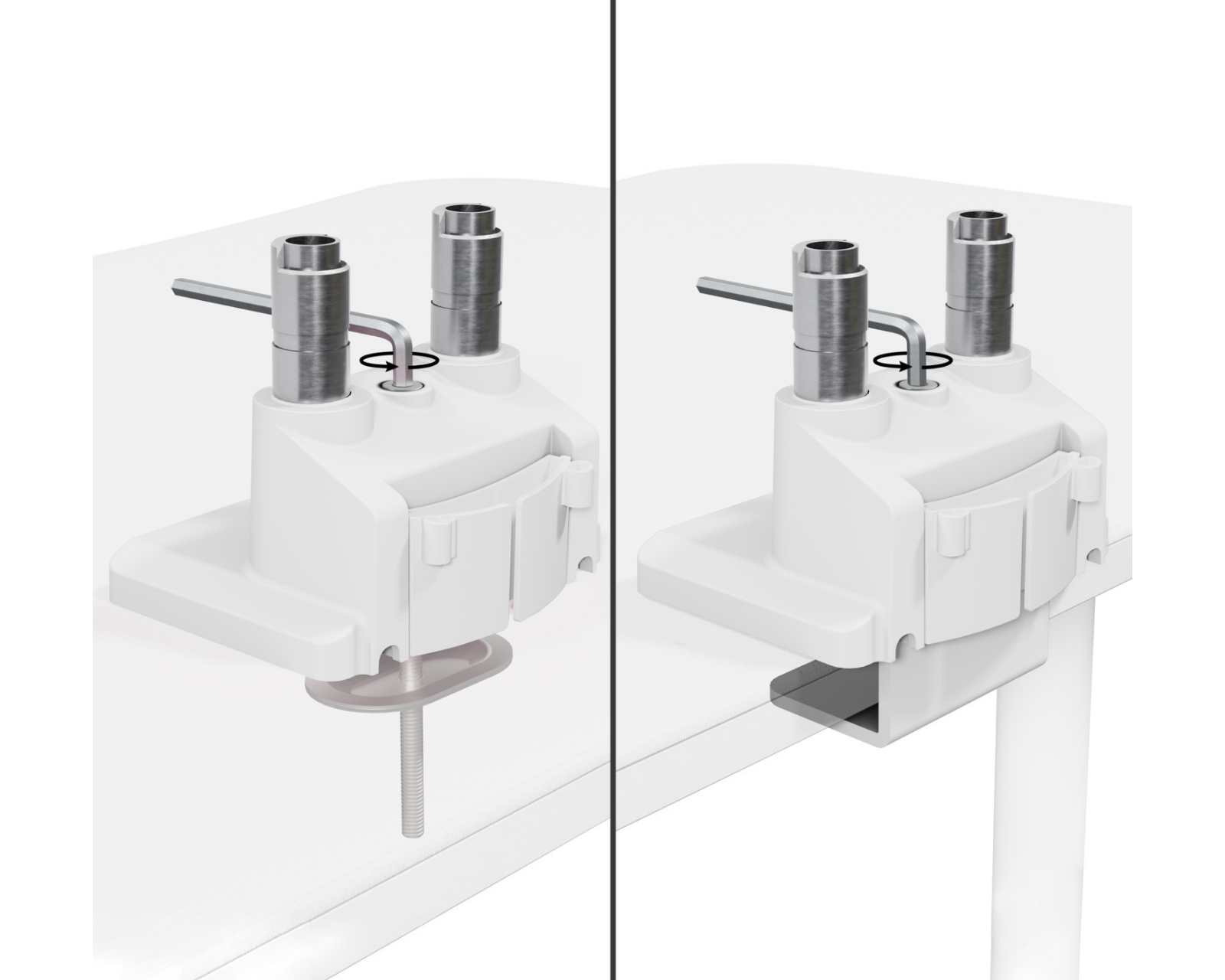 Näyttötuki on valmistettu teräksestä ja tarjoaa korkean kestävyyden ja vakauden. Kaltevuusmahdollisuudet +45°:sta -45°:seen ja kääntösäde +90°:stä -90°:een mahdollistavat jokaisen näytön kulman säätämisen ergonomisesti oikeaan asentoon. Kierto tapahtuu 360 astetta, mikä antaa suuren joustavuuden käytössä. Asennus tapahtuu puristimella, mikä helpottaa asennusta pöydälle. Tuessa on myös sisäänrakennettu kaapelinhallinta, joka pitää työtilan siistinä ja vapaana kaapeleista.