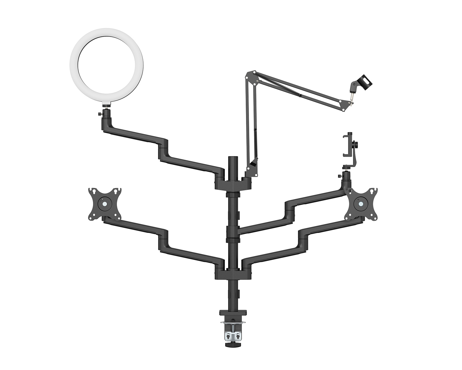 Desktop Multi-Mount voidaan asentaa useimpiin pöytäpintoihin. Ammattimaisen suunnittelunsa ja täyden säädettävyyden ansiosta Desktop Multi-Mount on täydellinen lisä kaikille sisällöntuottajille. Lisää Multi-Mount-teline suoratoistotyökalulaatikkoosi ja anna luovuuden ja luomisen virrata.