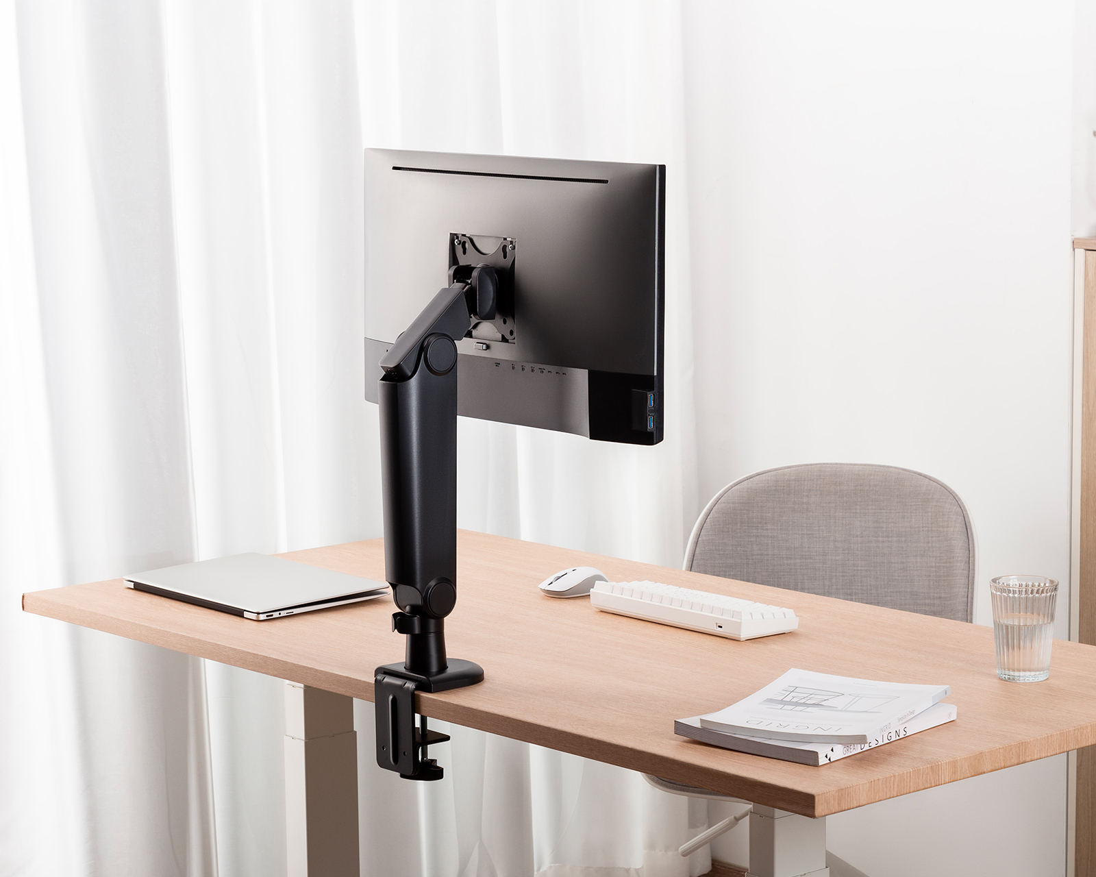 Tässä näytön varressa on mekaaninen jousi, ja se on valmistettu tukevasta teräksestä, alumiinista ja muovista, ja se on taatusti helppo tukea näyttöäsi. Mattamusta pulverimaalaus ei ainoastaan lisää modernia ilmettä, vaan myös varmistaa kestävyyden ja kulutuskestävyyden.