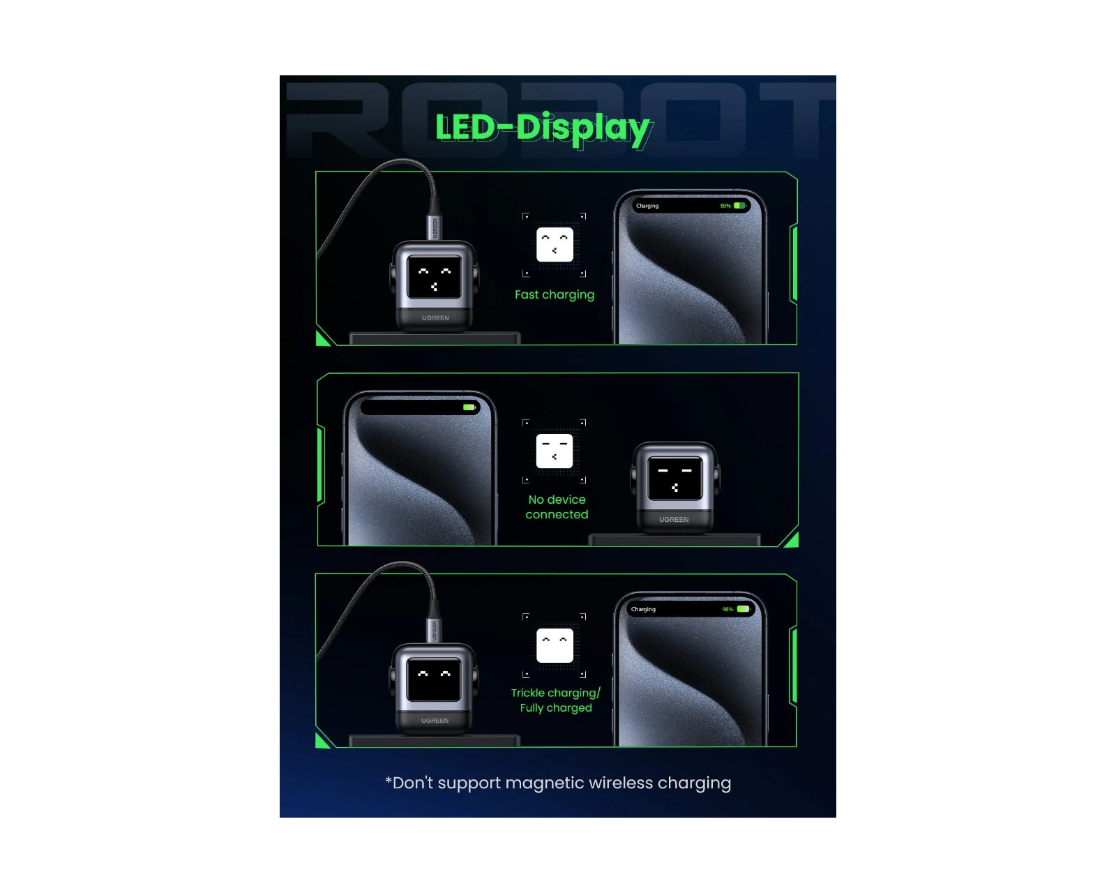 Nexode Robot -laturit eivät ole vain käytännöllisiä vaan myös tyylikkäitä, joten ne ovat täydellinen yhdistelmä modernia tekniikkaa ja käyttäjäystävällisiä toimintoja. Tämä ainutlaatuinen muotoilu tekee lataamisesta yksinkertaista, sujuvaa ja tehokasta, mikä parantaa käyttökokemusta.