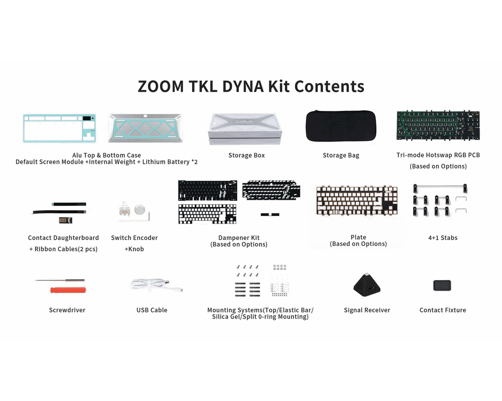 ZOOM TKL DYNA on Wuque Studion barebones-kitti, joka tarjoaa monipuolisen käyttökokemuksen. Modulaarinen muotoilu mahdollistaa näytön ja säädinten säätämisen, mikä antaa käyttäjille vapauden mukauttaa asetuksiaan. Laite sisältää 6063-alumiinikuoren ja ruuvittoman pallokannan järjestelmän, joka mahdollistaa helpon vaihtamisen eri asennusvaihtoehtojen välillä. Se tukee sekä langallista yhteyttä USB-C:n kautta että langatonta yhteyttä Bluetooth 5.4:llä ja 2.4 GHz:llä.