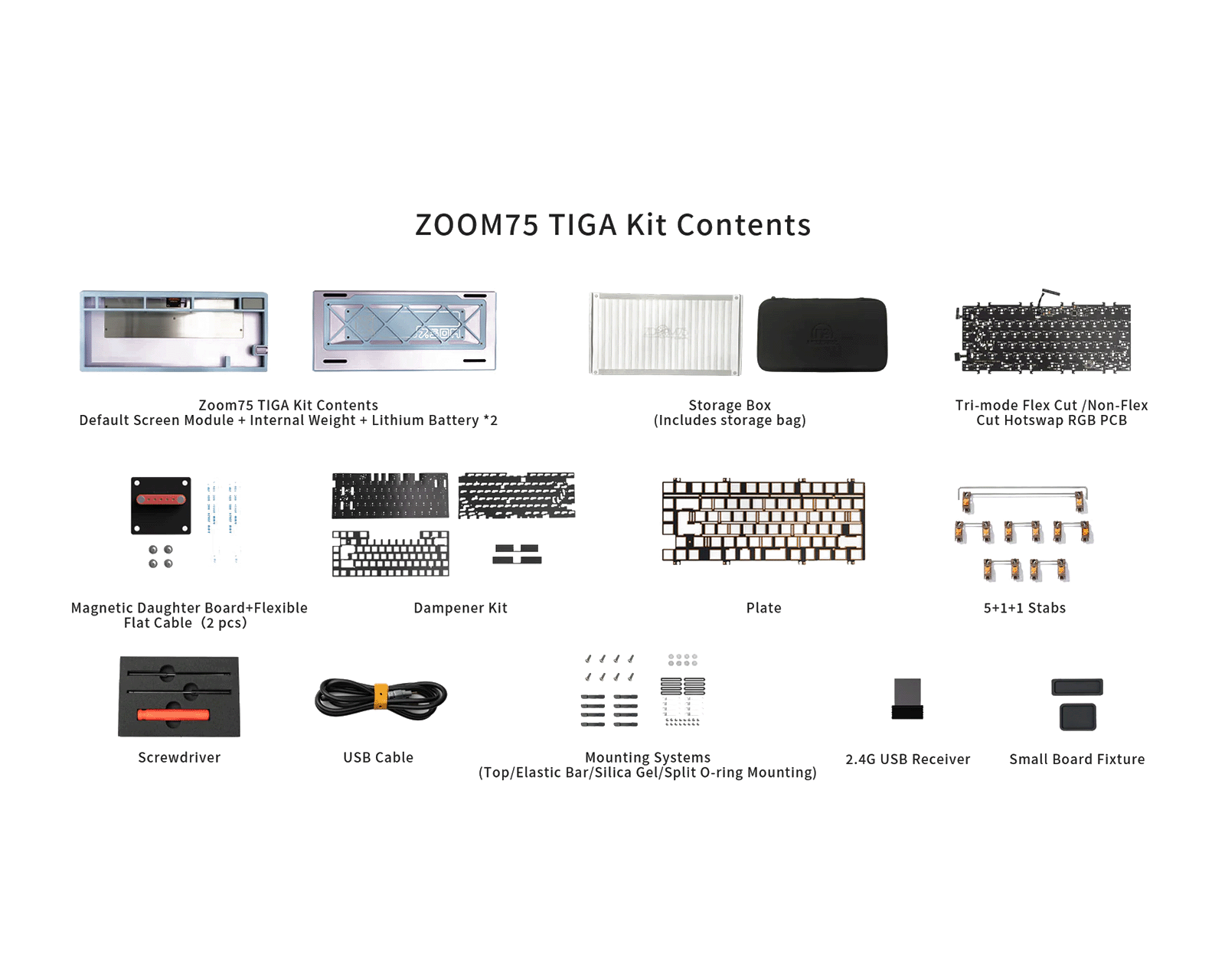 Nykyajan LED-tekniikalla, säädettävällä näytöllä ja mukautettavilla yksityiskohdilla, kuten kaksinkertaiset siipipaneelit, Zoom75 TIGA on sekä toiminnallinen että esteettinen. Tri-mode-yhteydellä ja parannetulla 8000 mAh akulla tämä näppäimistö on räätälöity sekä suorituskyvyn että tyylin kannalta.