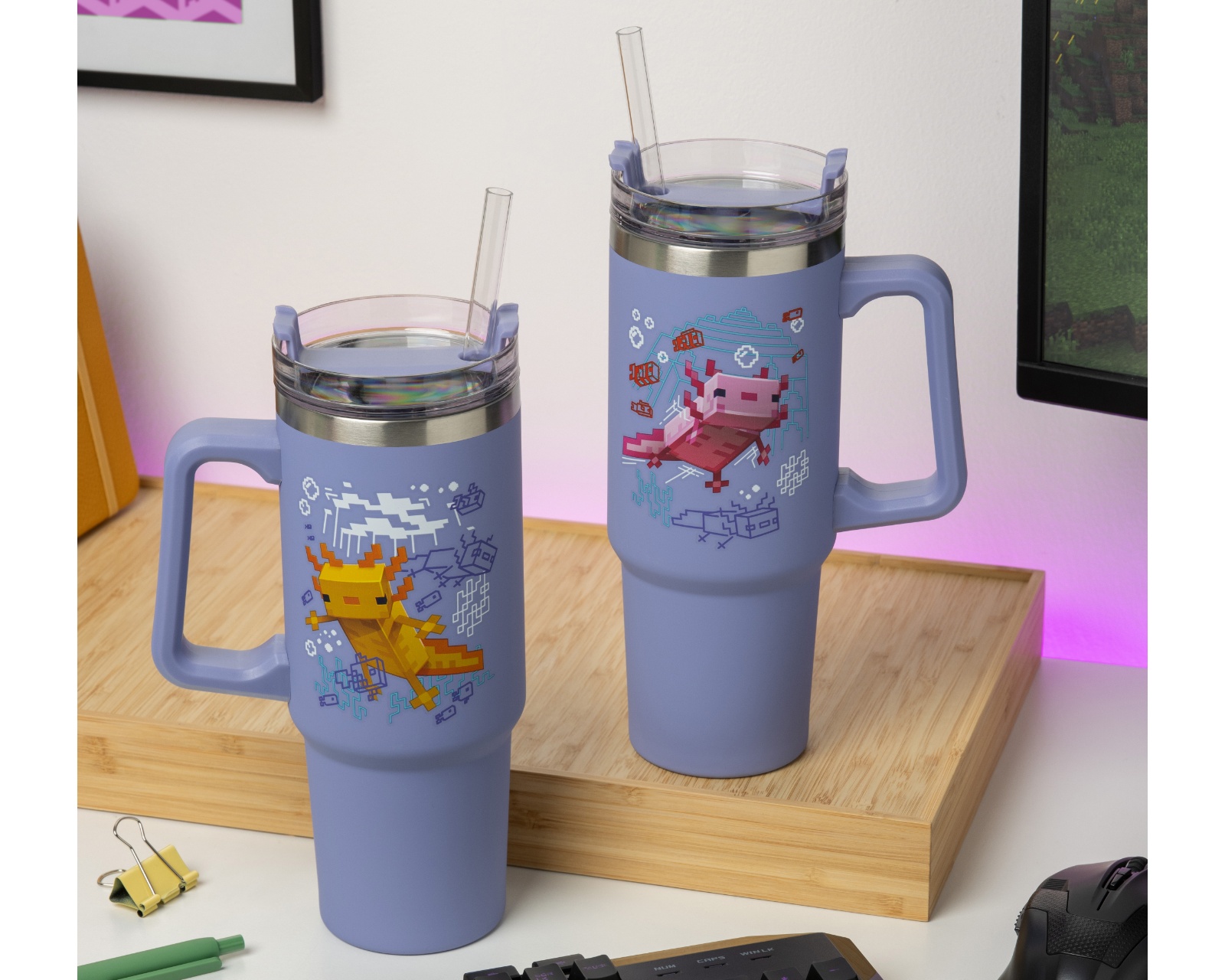 Minecraft Tumbler Cup 900ml on eristetty juomamuki, joka on suunniteltu pitämään juomasi kylminä tai kuumina pidempään. 900ml:n tilavuudellaan ja violetilla värillään tämä muki on sekä käytännöllinen että tyylikäs. Se sopii täydellisesti peliharrastajille, jotka haluavat pitää juomansa käden ulottuvilla koko päivän.Mukissa on innovatiivinen kolmitoimintoinen kansiratkaisu, johon kuuluu suljettu pilliaukko, helposti tavoitettava siemausmuotoilu ja suojaava kansi liikkeelläoloa varten. Käytännöllinen kahva on ergonomisesti muotoiltu takaamaan mukavan otteen kuljetuksen aikana. Ohut pohja tarkoittaa, että muki sopii täydellisesti useimpiin auton mukitelineisiin. Huomaa, että mukia ei voi pestä astianpesukoneessa tai mikroaaltouunissa, ja se tulee puhdistaa lämpimällä saippuavedellä koristeen säilyttämiseksi.