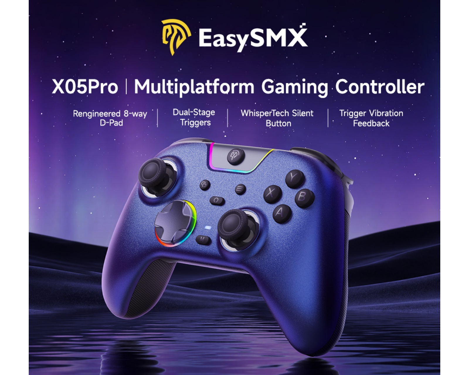 EasySMX X05Pro on langaton peliohjain, joka tukee useita alustoja. Se on erityisesti suunniteltu käytettäväksi PC:llä, Nintendo Switchillä ja mobiililaitteilla. Ohjaimessa on äänieristyspainikkeet hiljaista pelielämystä varten ja se tarjoaa edistyksellisen kaksivaiheisen Hall-trigger-ratkaisun lisääntyneeseen tarkkuuteen peliohjauksessa. Se on rakennettu korkealaatuisista materiaaleista ja integroi Hall-efekti joystickit, jotka mahdollistavat pitkäkestoisen ja responsiivisen käytön.Lisäksi se tarjoaa 8-suuntaisen D-pad:in tarkkaan suuntaan ja yhdistelmien toteuttamiseen sekä päivitetyn tärinäsysteemin parannettuun palautteeseen pelin aikana. Ohjain tukee myös RGB-valaistusta, jossa on mukautettavissa olevat värit henkilökohtaista kosketusta varten.