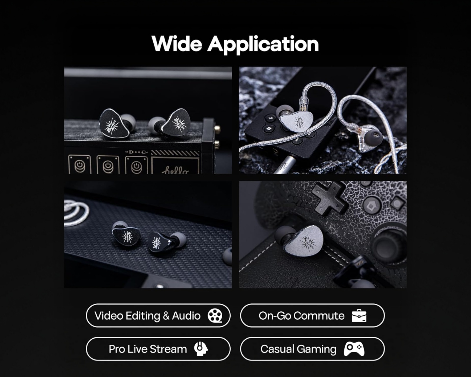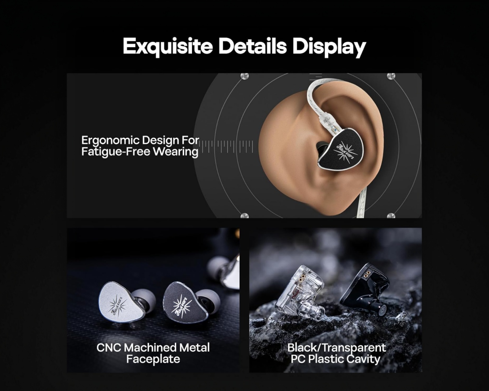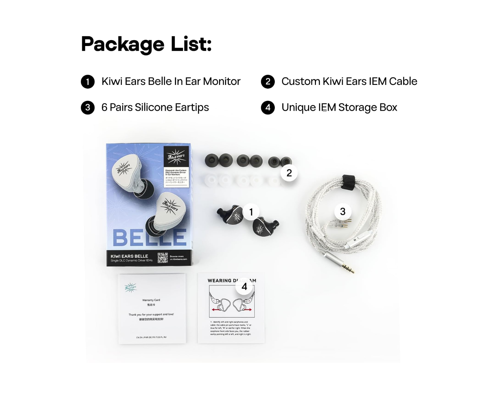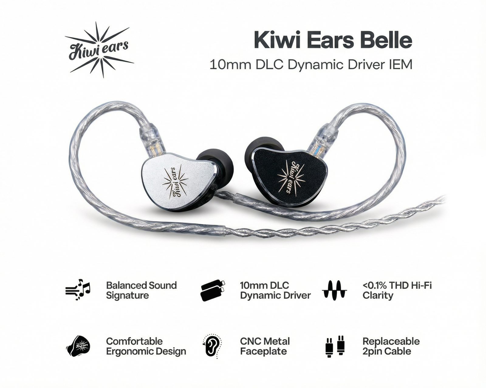 Kiwi Ears Belle on ammattilaislaatuinen in-ear-monitor (IEM), joka yhdistää 10 mm DLC-dynaamisen elementin viehättävään muotoiluun ja korkeaan äänentoistoon. 32 Ohmin impedanssilla ja tasapainoisella tonaalisella ssignatuurilla Belle on suunniteltu tarjoamaan mukaansatempaavan kuuntelukokemuksen, olipa kyseessä musiikin tuotanto, pelaaminen tai live-esitykset. Se on monipuolinen kuulokemalli, joka käsittelee erilaisia musiikkigenrejä syvällä bassolla ja kirkkalla keskialueella, mikä tekee siitä ihanteellisen sekä audiophileille että ammattilaiskäyttäjille.CNC-koneistetuilla metalliefekteillä varustettu Belle tarjoaa ensiluokkaisen tuntuman ja kestävyyden. Kiwi Earsin viimeisimmän sukupolven Diamond-Like Carbon (DLC) kalvo auttaa aikaansaamaan nopeamman ja herkemmän äänen toiston, kokonaisvaltaisen harmonisen vääristymän (THD) ollessa alle 0,1 % 1 kHz:ssä. Kaapelivaihtoehtoihin kuuluu tyypin C ja 3,5 mm, mikä tarjoaa joustavuutta laitteen käytön mukaan. Hopeoitettu kaapeli maksimoi signaalin siirron ja kykenee toistamaan korkeataajuisten yksityiskohtien, mikä tarjoaa ylivoimaisen äänikokemuksen. Belle on tarkoitettu niille, jotka etsivät parasta ääntä sekä matkustettaessa että live-esityksissä.