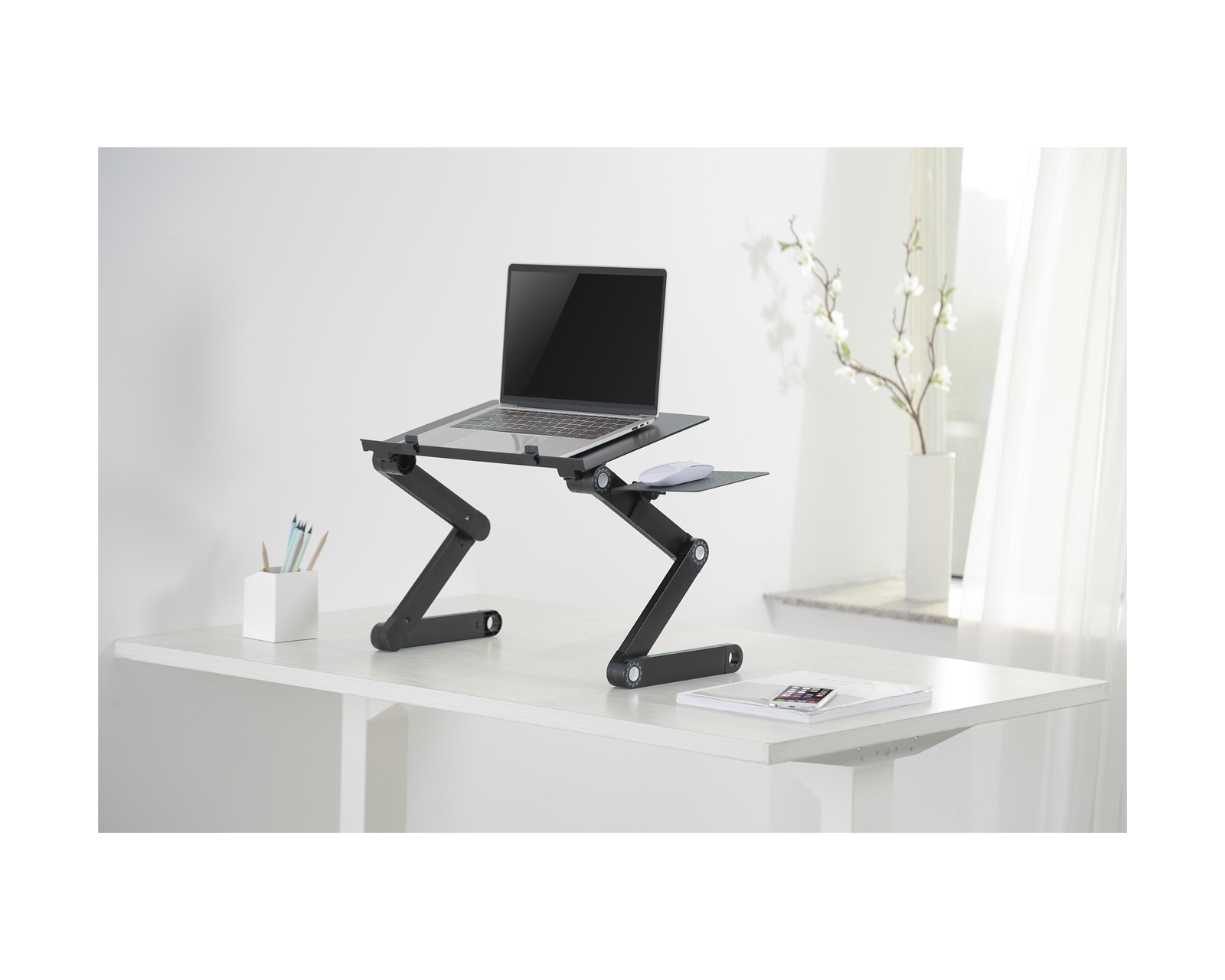 MaxMount Adjustable Laptop Stand on paras ratkaisu niille, jotka haluavat työskennellä ergonomisemmin ja mukavammin. Käännettävän pöydän ja 360 astetta säädettävien jalkojen ansiosta voit helposti säätää asentoa tarpeidesi mukaan, olitpa sitten työpöytäsi ääressä, sängyssä tai sohvalla. Kevyessä alumiinirungossa yhdistyvät vakaus ja tyyli, kun taas turvareuna estää laitteitasi liukumasta. Painikkeiden lukitusmekanismin ansiosta korkeus ja kulma voidaan kiinnittää turvallisesti, mikä varmistaa, että kannettavan tietokoneen teline on aina optimaalisessa asennossa. Käytätpä sitä kannettavan tietokoneen jalustana, seisomapöytänä tai TV-tasona, saat sekä vapautta että joustavuutta työympäristöösi.Tämä kannettavan tietokoneen teline on suunniteltu vähentämään niska- ja hartiakipuja, jotka johtuvat usein huonosta asennosta tietokoneella työskennellessä. Nostamalla ja kallistamalla tietokonetta oikeaan asentoon, asento paranee ja tekee työstä hellävaraisempaa vartalolle. Se on kooltaan 420 x 270 x 40-480 mm, ja se on kompakti ja helposti taitettava kuljetusta varten, joten se on täydellinen kumppani jokapäiväiseen käyttöön tai matkoille. Ergonomisen toiminnon lisäksi se sopii mainiosti myös kirjatelineen tai tablettitelineen.