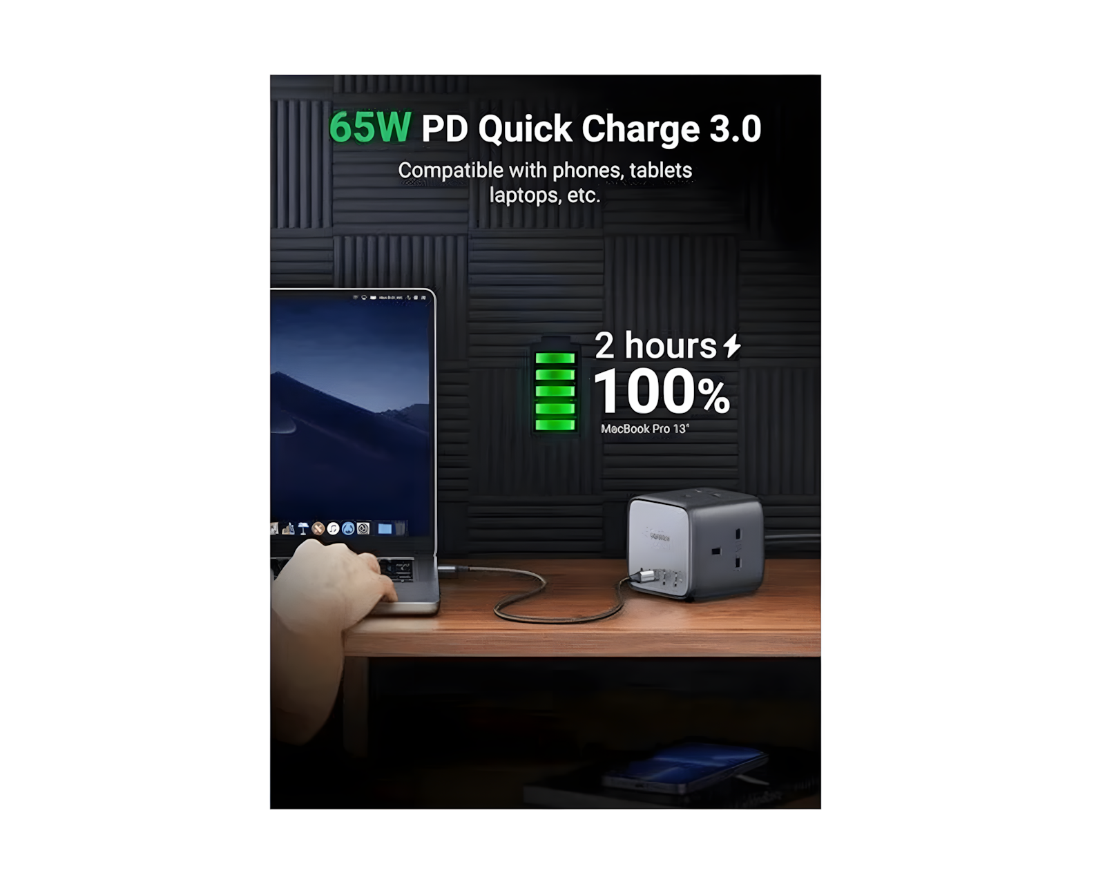 Esittelyssä UGREEN DigiNest Cube -virtajohto, täydellinen ratkaisu kaikkiin lataustarpeisiisi. Tämä innovatiivinen jatkojohto on varustettu 3 AC-pistorasialla, 2 USB-A-portilla ja 2 PD 3.0 -pikalataus-USB-C-portilla, joten voit ladata jopa 7 laitetta samanaikaisesti. 65 W:n maksimilähtötehon ansiosta tämä jatkojohto täyttää vaativimpienkin laitteiden tehovaatimukset.UGREEN DigiNest Cube -pistorasia on todellinen voimanpesä. 65 W:n maksimiteho C1- tai C2-portin kautta tarkoittaa, että voit ladata 13" MacBook Pron jopa kahdessa tunnissa. Sano hyvästit pitkille latausajoille ja tervetuloa tuottavuudelle. Oletpa sitten opiskelija, ammattilainen tai matkustat paljon tämä jatkojohto mullistaa tavan, jolla lataat laitteesi.