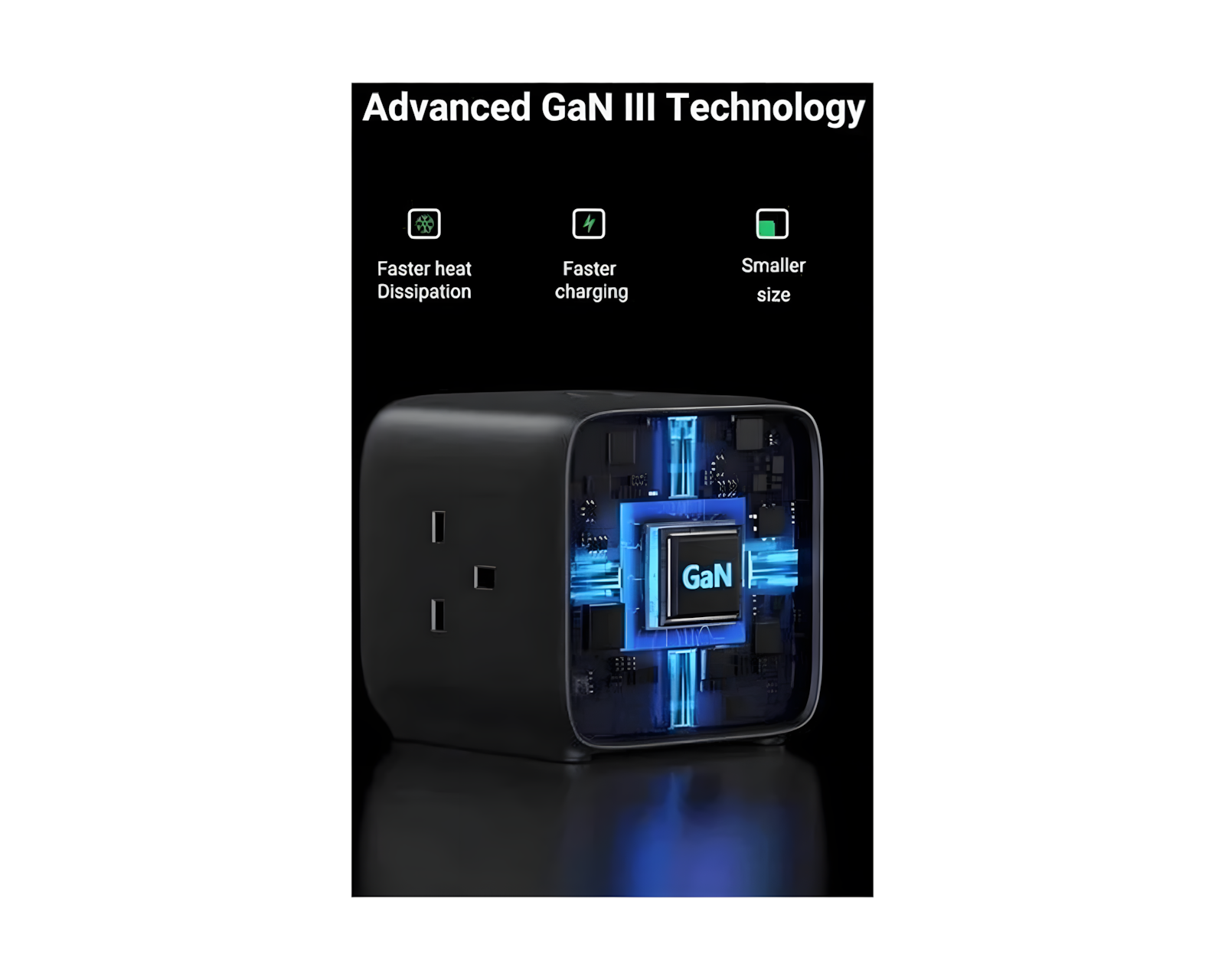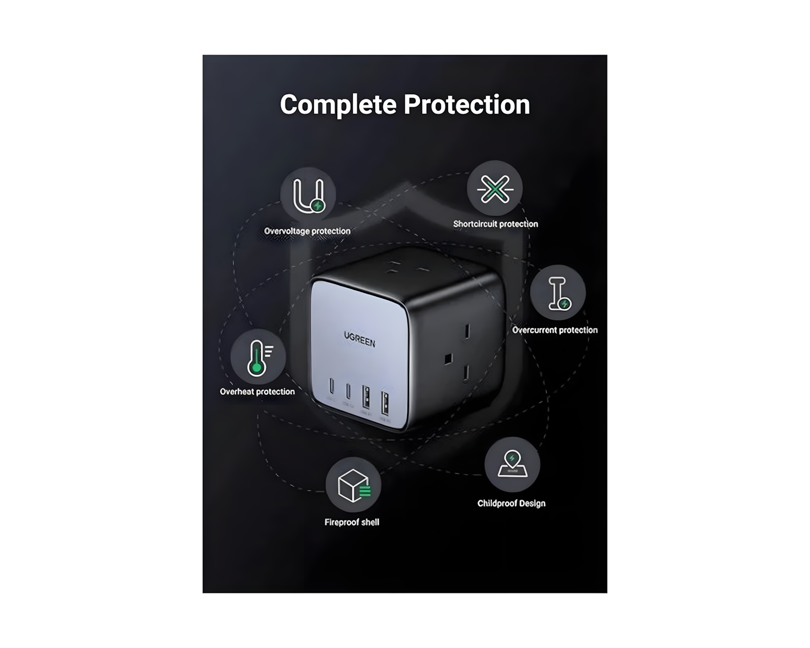 Yksi UGREEN DigiNest Cube Power Stripin tärkeimmistä ominaisuuksista on GaN III -sirun käyttö. Tämä uraauurtava tekniikka mahdollistaa nopeamman ja tehokkaamman latauksen varmistaen, että laitteesi ovat käyttövalmiita hetkessä. Lisäksi tämä jatkojohto on rakennettu kestämään, ja sen EU-luokitus on enintään 3680W, 16A ja 250V~. Se on täydellinen kumppani kaikille elektronisille laitteillesi tietokoneista ja televisioista vedenkeittimiin ja pöytälamppuihin.