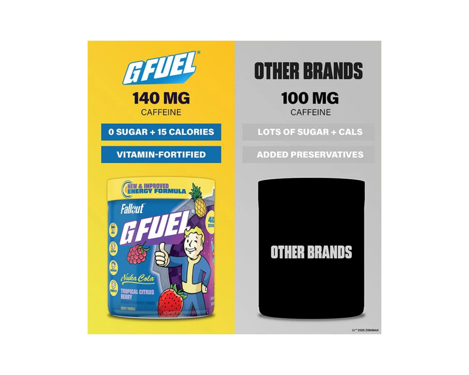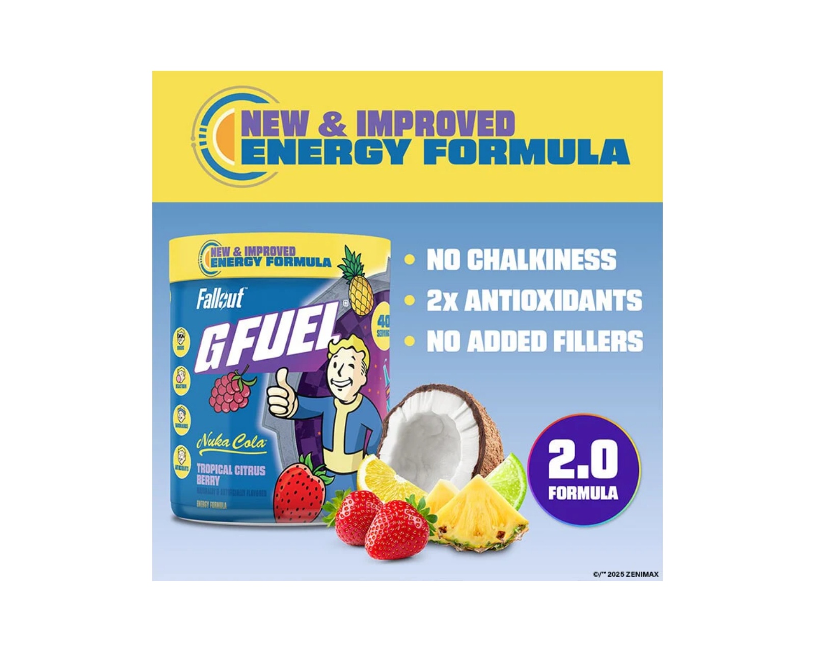 Nuka Cola 2.0 G FUEL:ilta yhdistää jääteetä ja sitruunalimonadia. Sisältää 40 annosta, joissa on 140 mg kofeiinia annosta kohti. Juomassa ei ole lisättyä sokeria, mikä tekee siitä vaihtoehdon ilman turhia kaloreita.Tuote on kehitetty tarjoamaan puhdasta ja luotettavaa energiaa ilman romahduksia. Se on täydellinen niille, jotka etsivät sokeritonta energianlisäystä. Juoman alhainen kaloriaines, jopa 10 kaloria annosta kohti, tekee siitä sopivan valinnan sekä pelaajille että aktiivisille ihmisille.