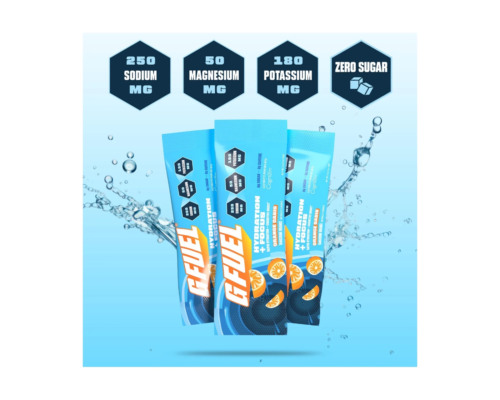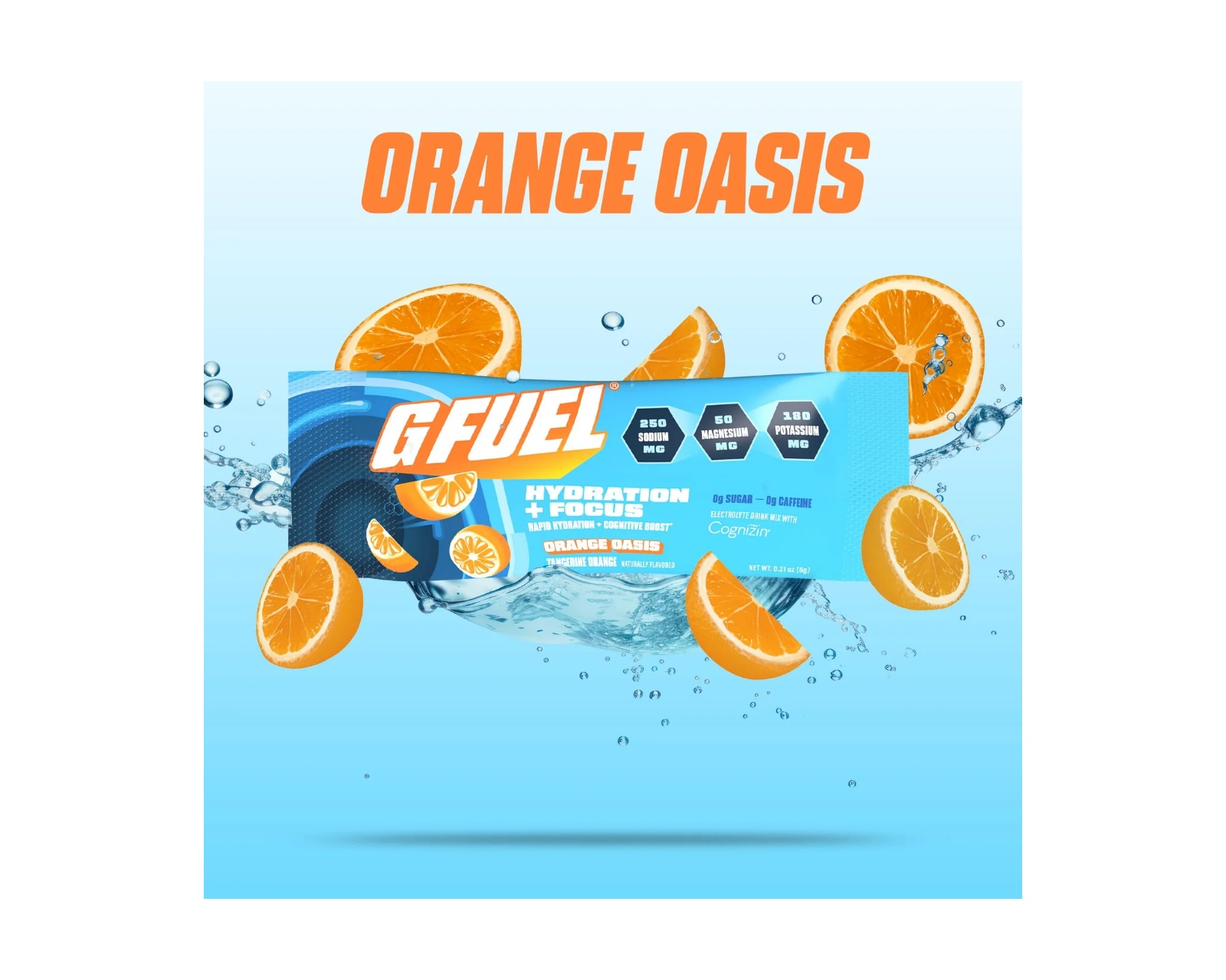 Orange Oasis Hydration + Focus Pack on elektrolyyttijauhe tuote G Fuelilta, joka on tarkoitettu välittömään nesteytykseen ja keskittymiseen. Yhdistelmä ainutlaatuisia elektrolyyttejä ja nootrooppisia aineita, tämä jauhe on sokeriton ja tarjoaa appelsiinimaisuuden makua. Jokaisessa pakkauksessa on 20 annosta, mikä tekee siitä sopivan käytettäväksi erilaisissa ulkoaktiviteeteissa tai treenauksen ja pelin aikana.Edistyksellinen elektrolyyttijauhe sisältää hyvin tasapainotetun koostumuksen viidestä avainelektrolyytistä optimaalisen nesteytyksen ja hengellisen kirkkauden tukemiseksi. Jokainen annos tarjoaa 250 mg natriumia, 50 mg magnesiumia ja 180 mg kaliumia, mikä edistää nopeaa nesteytystä ilman suolaista jälkimakua. Jauhe sisältää myös Cognizinia tukemaan huomiota ja muistia. Orange Oasisissa on vain 15 kaloria per annos.