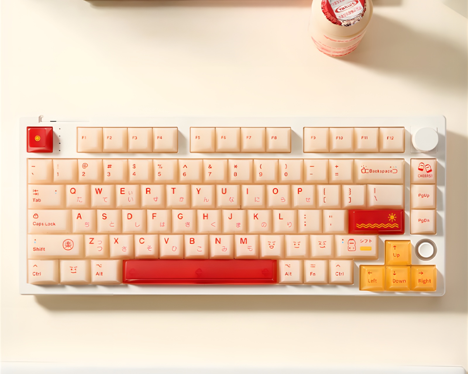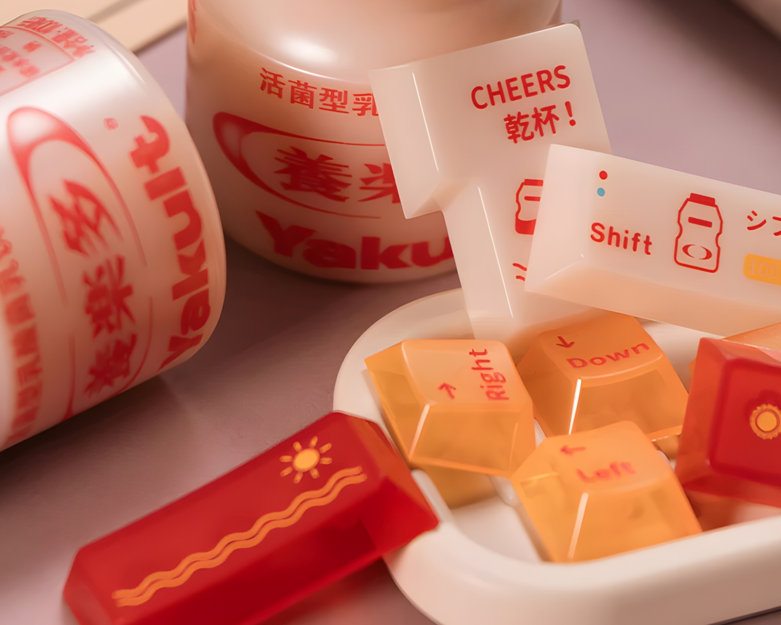Sopivasti! Keycap-setti Keymoji:lta tarjoaa visuaalisen nostalgiamatkan, joka on saanut inspiraationsa ikonista probioottista juomasta Yakult. Klassisen valkoisen pullonsa, vaaleankeltaisten ja eloisan punaisten yksityiskohtien ansiosta tämä setti luo raikkaan ja leikkisän estetiikan, joka tuo mieleen onnellisia muistoja Yakultin nautiskelusta. Setti koostuu 148 näppäimestä, joissa on Cherry-profiili ja jotka ovat yhteensopivia MX-kytkimien kanssa, ja tämä keycap-setti on täydellinen kaikentyyppiseen käyttöön, olivatpa ne sitten pelaamista, työskentelyä tai opiskelua.Rakennettu korkealaatuisesta PC-muovista, nämä keycapit ovat kestäviä ja kulutusta kestäviä, mikä tekee niistä sopivia päivittäiseen käyttöön pelissä tai toimistoympäristössä. Värikäs muotoilu, jossa on yksinkertaisia kuvioita, hauskoja ikoneita ja piilotettuja emojeita, antaa jokaiselle näppäimelle leikkisän luonteen, joka piristää jokaista näppäilyä. Ruiskuvalumenetelmän ansiosta värit ovat eloisat ja pitkäkestoiset. Nämä keycapit eivät ole vain käytännöllisiä, vaan myös upea keräilyesine jokaiselle näppäimistöharrastajalle.