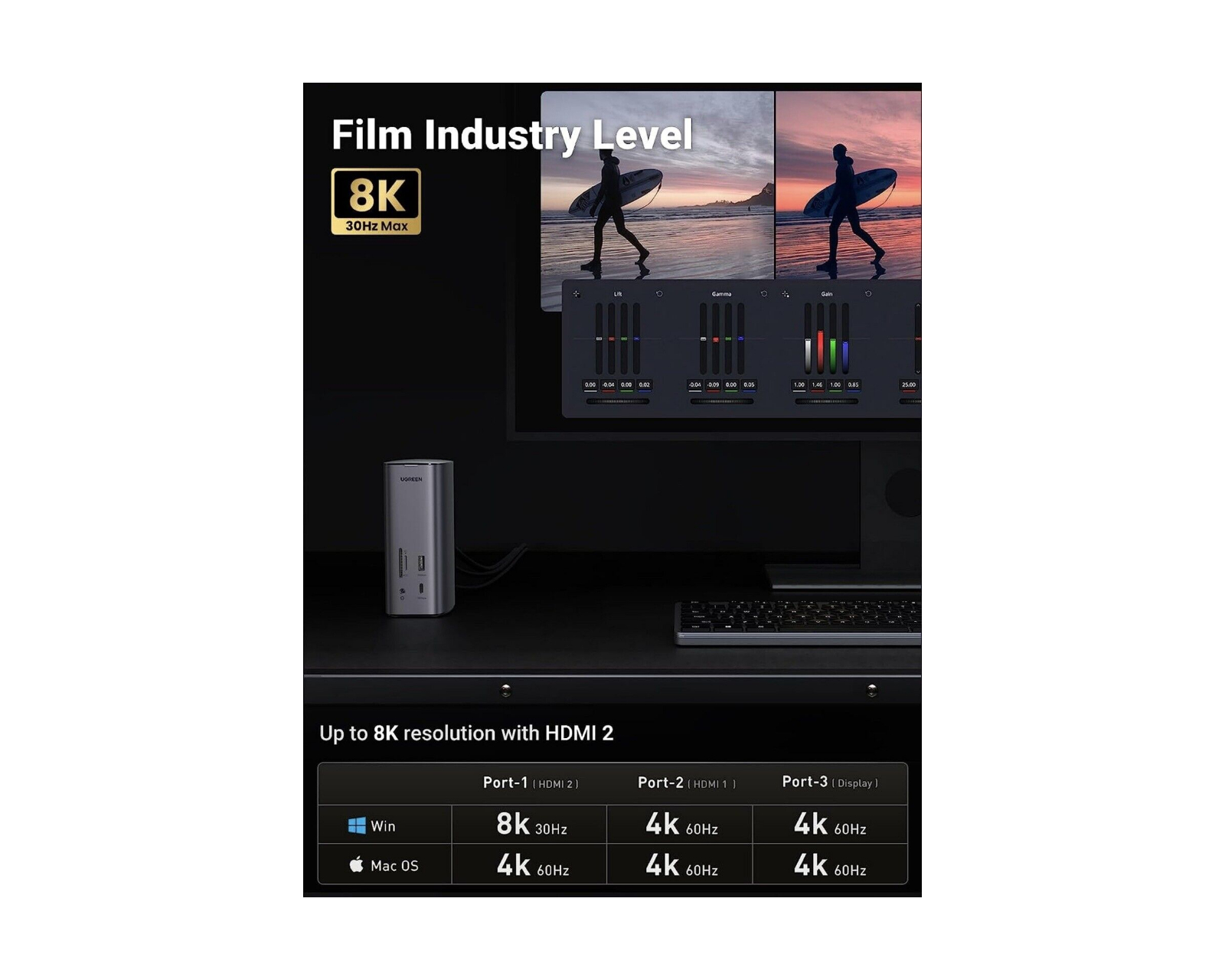 Lisäksi telakointiasemassa on HDMI-portti, joka tukee myös 4K:ta 60 Hz:llä, ja toinen HDMI-portti, joka pystyy 8K:n 30 Hz:iin, mikä tarkoittaa, että voit liittää useita korkearesoluutioisia näyttöjä. USB-C PD -portti mahdollistaa laitteidesi nopean latauksen, kun taas 1000 Mbps:n RJ45-portti tarjoaa vakaan ja nopean internetyhteyden.