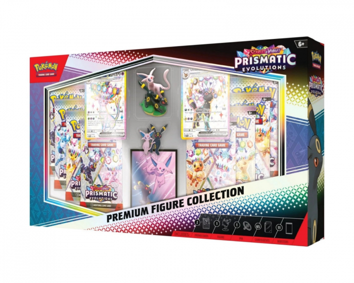Scarlet & Violet 8.5: Prismatic Evolutions Premium Figuri-kokoelma on Pokémon-kokoelma, joka sisältää kaksi ainutlaatuista kaiverrettua foliopromokorttia: Espeon ex ja Umbreon ex. Kokoelma tarjoaa myös figuurit Espeonista ja Umbreonista, keräilypinnin samasta teemasta sekä 65 korttisuojaa, joihin on kuvattu näitä Pokémonia. Lisäksi kokoelmaan kuuluu 11 boosterpakettia Scarlet & Violet -Prismatic Evolutions -laajennuksesta, mikä tekee siitä mielenkiintoisen apuvälineen pelaajille, jotka keräävät kortteja. Mukana on myös koodikortti Pokémon TCG Live -peliin, joka antaa pääsyn digitaaliseen peliin.Kokoelman materiaali on korkealaatuista rakennetta, ja kortit on suunniteltu kestämään ja keräilijäystävällisiksi. Pakkaus on näyttelyystävällinen, mikä tekee kokoelman esittelemisestä helppoa. Jokaisessa boosterpaketissa on 10 korttia sekä 1 Perusenergia, mikä lisää pelin strategista syvyyttä ja vaihtelua. Korttien design ja tekstuuri varmistavat, että ne erottuvat visuaalisesti ja pelifunktionaalisuuden kannalta.