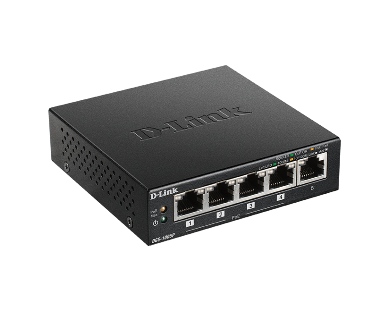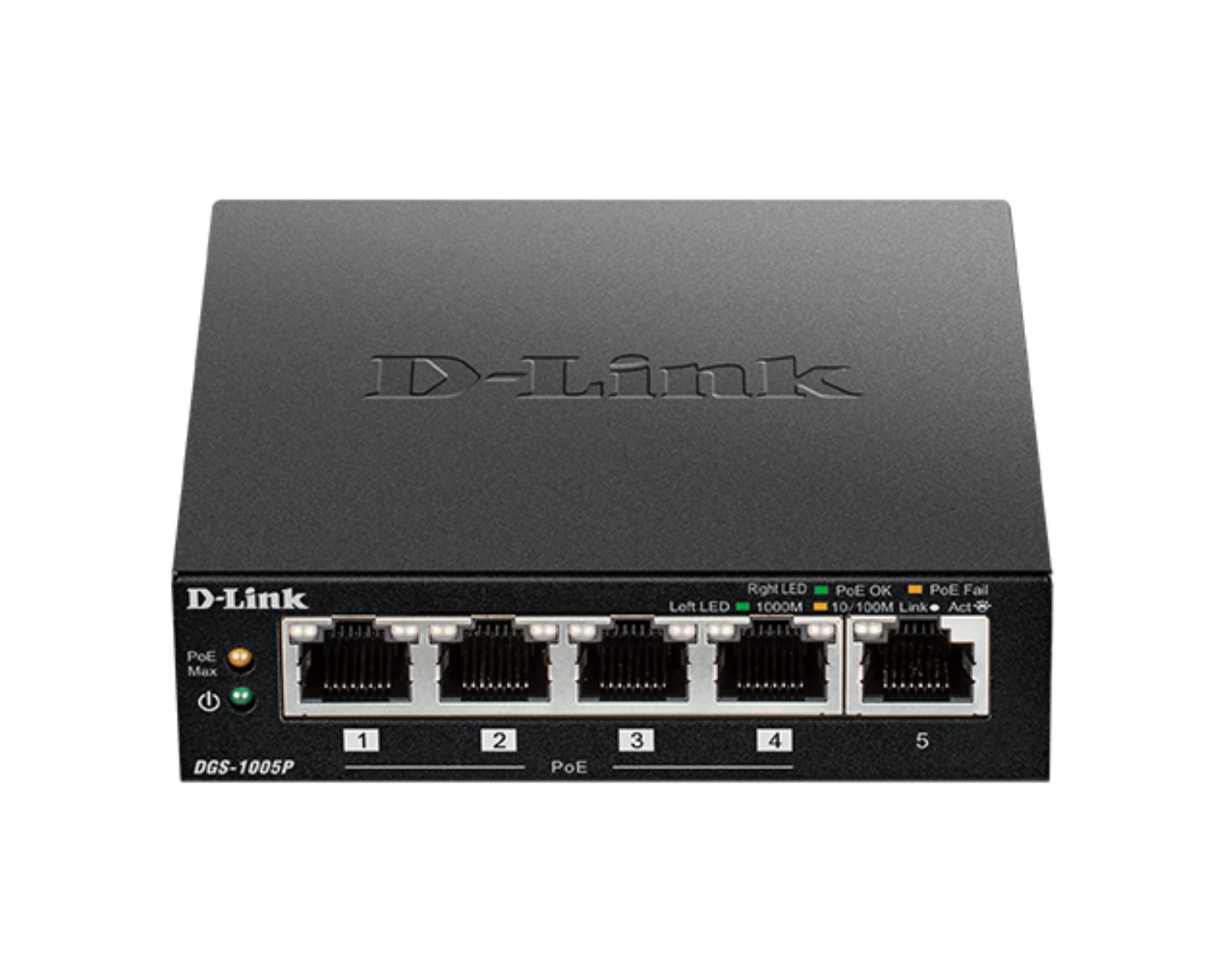 DGS-1005P on D-Linkin 5-porttinen työpöytä Gigabit PoE+ -kytkin. Tämä laite mahdollistaa Power over Ethernet (PoE) -laitteiden, kuten langattomien päätepisteiden, verkkokameroiden ja IP-puhelimien, liittämisen. DGS-1005P:llä on yhteispäätöskyky 10 Gbps ja PoE+ -tehopudjetti 60 W, mikä tekee siitä sopivan koteihin ja pienyrityksiin.DGS-1005P:ssä on viisi Gigabit Ethernet -porttia, joista neljä tukee IEEE 802.3af ja 802.3at PoE, tarjoten jopa 30 W jokaiseen PoE-porttiin. Laite ei vaadi konfigurointia ja siinä on plug-and-play -toimintoja helppoa asennusta varten. Automaattinen MDI/MDI-X-tuki poistaa crossover-kaapelin tarpeen, ja älykäs nopeuden säätö jokaisessa portissa varmistaa yhteensopivuuden liitettyjen laitteiden kanssa. Tuulettimettomassa suunnittelussa DGS-1005P toimii hiljaisesti, mikä tekee siitä sopivan ääniherkkiin ympäristöihin.