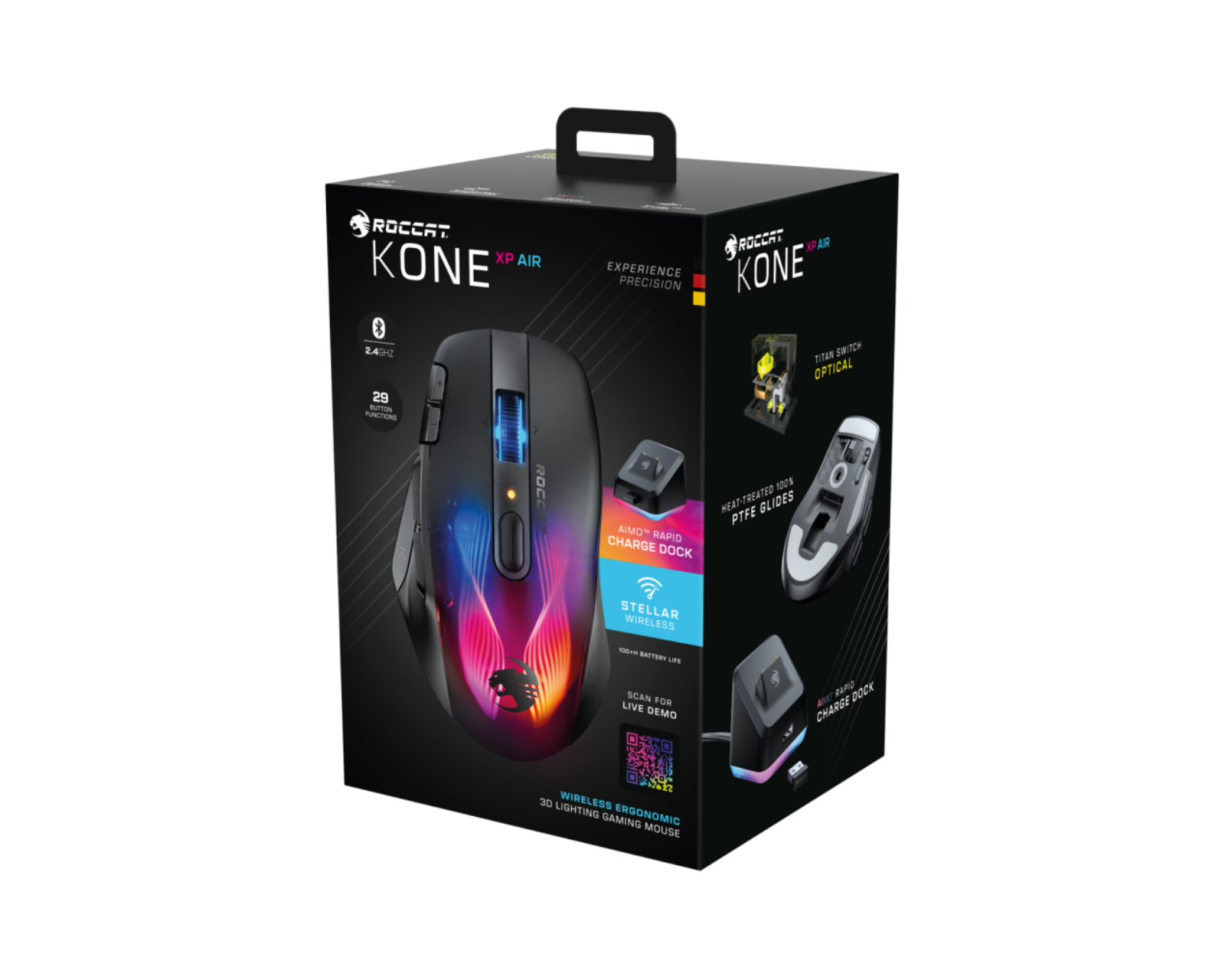 Tutustu langattomaan Turtle Beach Kone XP Air -pelihiiriin ? äärimmäiseen hiiriin pelaajille, jotka etsivät sekä mukavuutta että suorituskykyä. Ergonomisen muotoilun ja edistyneen 19 000 DPI:n Owl Eye -sensorin ansiosta saat tarkat ja sujuvat liikkeet joka pelihetkellä. Viisi dynaamista RGB-vyöhykettä AIMO-valaistusjärjestelmällä lisäävät väriä ja eloisuutta pelikokemukseesi, kun taas PTFE-koteloidut jalat takaavat sujuvat ja herkät liikkeet.Hiiressä on 10 ohjelmoitavaa painiketta, mukaan lukien EasyShift[+], joilla voit mukauttaa komennot pelityyliisi sopivaksi. Valitse tarvittaessa langaton yhteys tai kaapeli. Kone XP Air yhdistää toiminnallisuuden, tarkkuuden ja ainutlaatuiset valotehosteet parantamaan jokaista istuntoa.