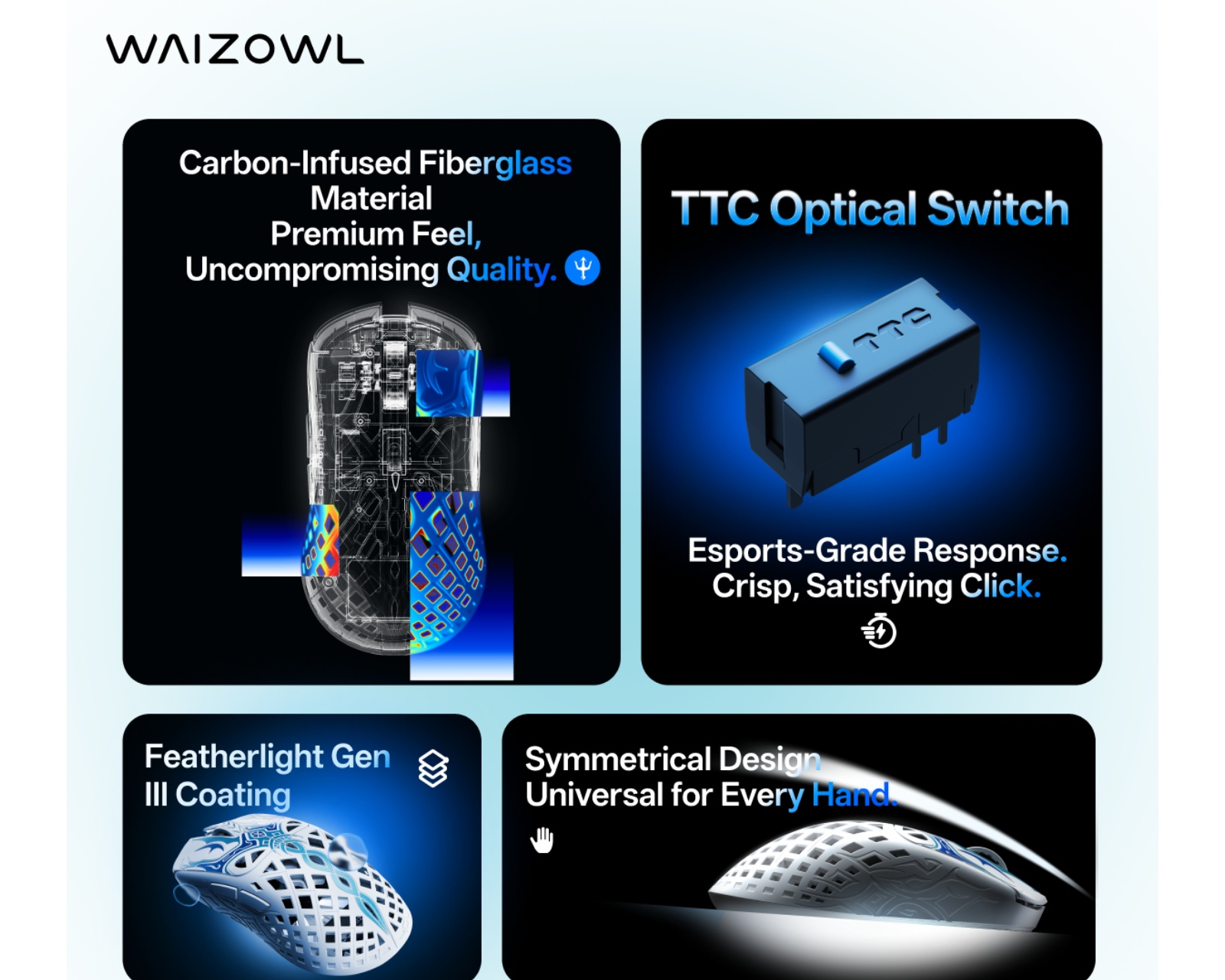 Waizowl tarjoaa innostuneille pelaajille pelitarvikkeita, joissa keskitytään laatuun ja käyttökokemukseen. Waizowl pyrkii laajentamaan suorituskyvyn rajoja kehittämällä jatkuvasti uusia ja innovatiivisia tuotteita. Jokainen lisävaruste on suunniteltu parantamaan pelikokemusta ja antamaan pelaajille etulyöntiaseman sekä satunnaisissa että ammatillisissa ympäristöissä. Intohimoisten asiantuntijoiden tiimin kanssa Waizowl työskentelee väsymättä tarjotakseen peliyhteisölle työkalut, joita he tarvitsevat menestyäkseen.