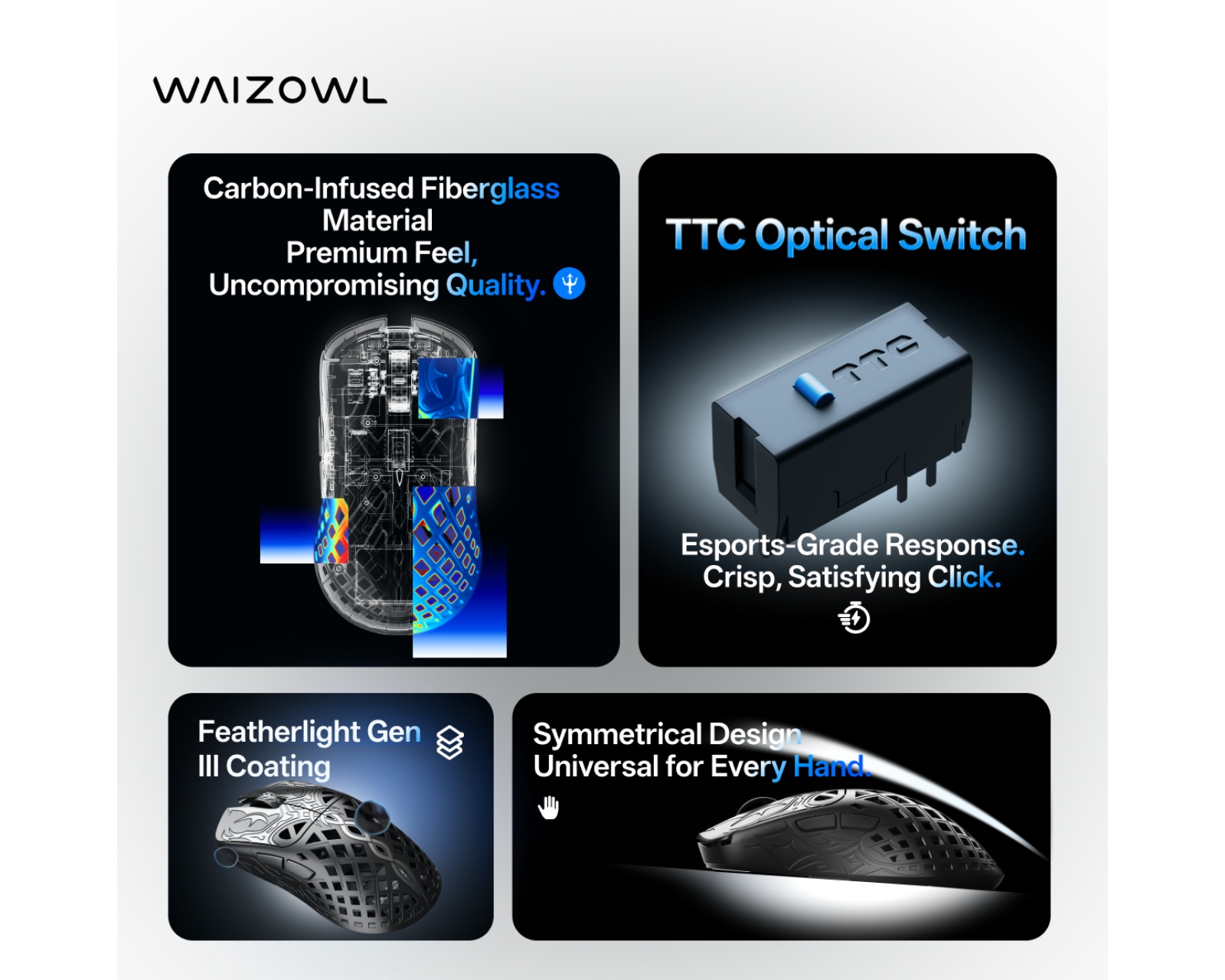 TRIAINA on langaton pelihiiri Waizowlilta, joka yhdistää äärimmäisen keveyden huipputeknologiaan. Sen paino on vain 49 grammaa, ja se tarjoaa yhden maailman nopeimmista latausratkaisuista 4C-akulla, mikä vie pelikokemuksen uudelle tasolle tarjoamalla täyden latauksen vain 22 minuutissa.Hiiren rakenne lasikuidusta ja polykarbonaatista lisää jäykkyyttä ja kestävyyttä tinkimättä painosta. Mukautettu 3950 HAWKEYE -anturi mahdollistaa pikselitason seurannan ja vakauden, mikä antaa pelaajille tarkan hallinnan intensiivisissä pelitilanteissa. Ergonominen matalaprofiilinen muotoilu on optimoitu eri otetyyleille, mikä maksimoi mukavuuden pidemmillä pelisessioilla. TRIAINA tarjoaa myös vaikuttavaa akkuaikaa, jopa 170 tuntia 1K polling rate -asetuksella, tukeakseen keskeytyksetöntä pelaamista.