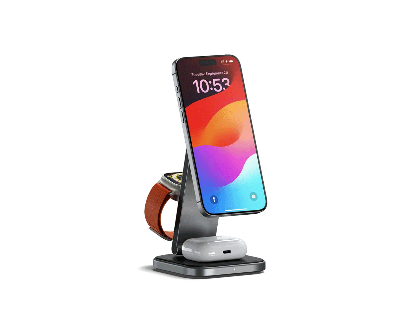 Tutustu latauksen tulevaisuuteen Satechi 3-in-1 Foldable Qi2 Charging Stand -lataustelineen avulla, joka on tyylikäs ja kompakti ratkaisu iPhonen, Apple Watchin ja AirPod-laitteiden lataamiseen samanaikaisesti. Tämä latausteline on suunniteltu yksinkertaistamaan jokapäiväistä elämääsi, ja siinä yhdistyvät sekä tyyli että toimivuus. Edistyksellisellä Qi2-tekniikalla saat nopeammat latausnopeudet ja maksimaalisen suorituskyvyn. Tämän ansiosta iPhonesi voi ladata jopa 15 wattia, kun taas AirPods ja Apple Watch saavat kumpikin 5 wattia. Teline tukee StandBy-tilaa, jonka avulla voit jatkaa puhelimen toimintojen käyttöä latauksen aikana. Pikalataustuen ansiosta Apple Watch voi olla valmis ennätysajassa, mikä tarjoaa sinulle maksimaalisen käyttömukavuuden joka aamu.Täydellinen tekniikkaa taitaville matkailijoille, taitettava muotoilu sopii kaikkeen kiireisistä työpäivistä pidempiin matkoihin. Kansainvälisten matkasovittimien ansiosta teline on valmis tarjoamaan kätevän latauksen missä tahansa. Vankka rakenne laadukkaasta alumiinista yhdistettynä naarmuuntumattomaan vegaaniseen nahkaan ja silikoniin, tarjoaa paitsi kestävän muotoilun myös modernin ja tyylikkään ulkonäön, joka sopii kaikkiin ympäristöihin.