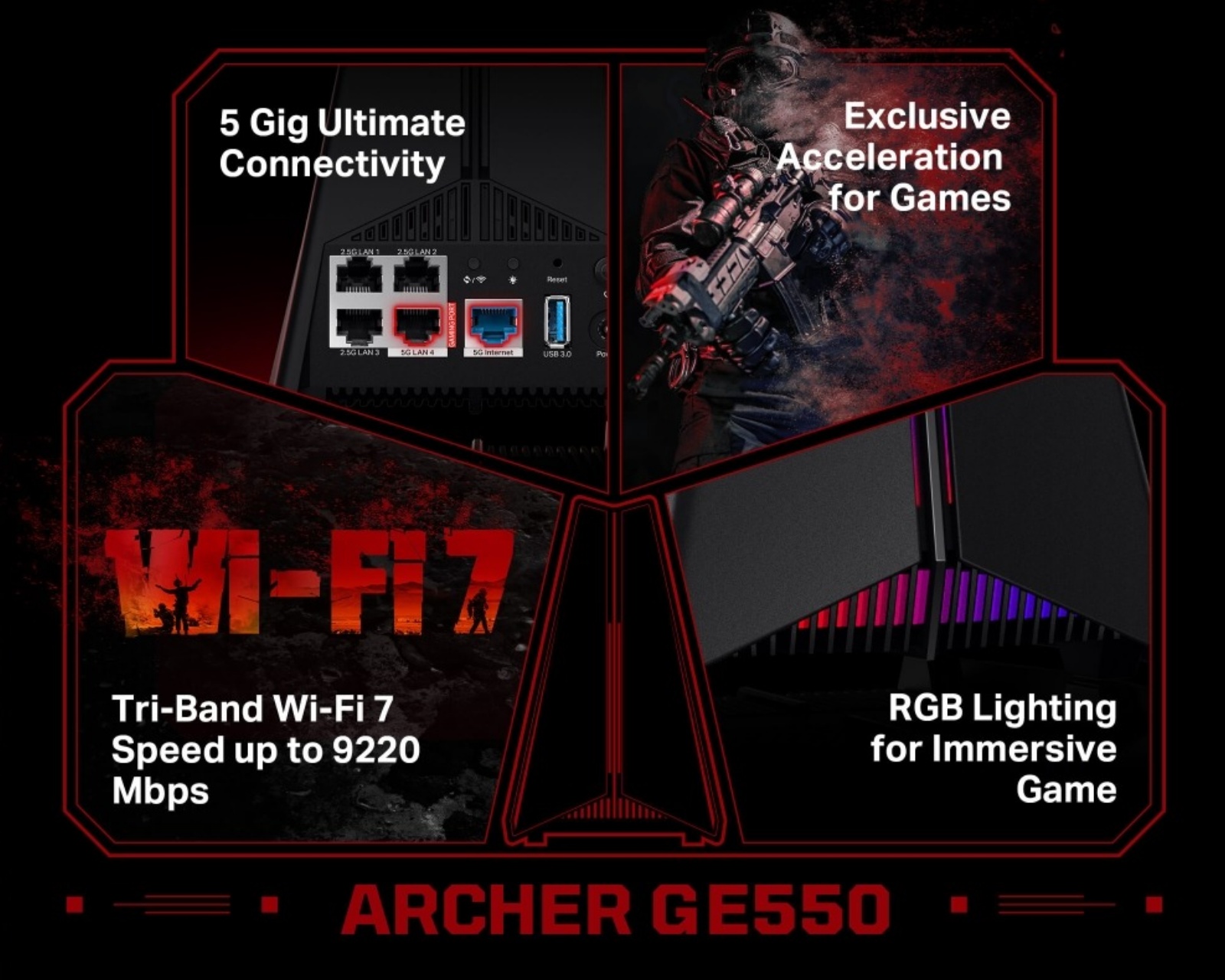 Archer GE550 on TP-Linkin tri-band Wi-Fi 7 -pelireititin, joka on erityisesti suunniteltu tarjoamaan erinomaisia nopeuksia jopa 9220 Mbps. 6 GHz-taajuus tuo mukanaan 5764 Mbps, 5 GHz-taajuudella on 2882 Mbps ja 2.4 GHz-taajuudella 574 Mbps, joten tämä reititin on suunniteltu pitämään pelisessiot vakaana ja nopeana. Kiitos omistetun 5 GHz -taajuuden pelaamiseen, voit nauttia alhaisesta viiveestä samanaikaisesti suoratoiston tai muiden laitteiden käytön kanssa kotona.Tämän kaliberin reitittimellä on oltava tukevat sisäiset komponentit, ja Archer GE550:ssä on tehokas quad-core CPU, joka maksimoi suorituskyvyn intensiivisen pelaamisen aikana. Multi-Link Operationin tuella voit käyttää 5 GHz ja 6 GHz -taajuuksia samanaikaisesti, mikä varmistaa vakaita yhteyksiä ja nopean tiedonsiirron. Reitittimen liitäntämahdollisuudet ovat myös vaikuttavat, 5 Gbps WAN-portilla ja useilla 2.5 Gbps LAN-poreilla, mikä mahdollistaa useiden laitteiden liittämisen samanaikaisesti ilman nopeuden heikentämistä. Tässä reitittimessä on myös omistettu pelipaneeli reaaliaikaisia näkemyksiä varten, mikä helpottaa strategista pelaamista ja tarjoaa informatiivisen yhteenvedon verkko- ja suorituskykytiedosta.