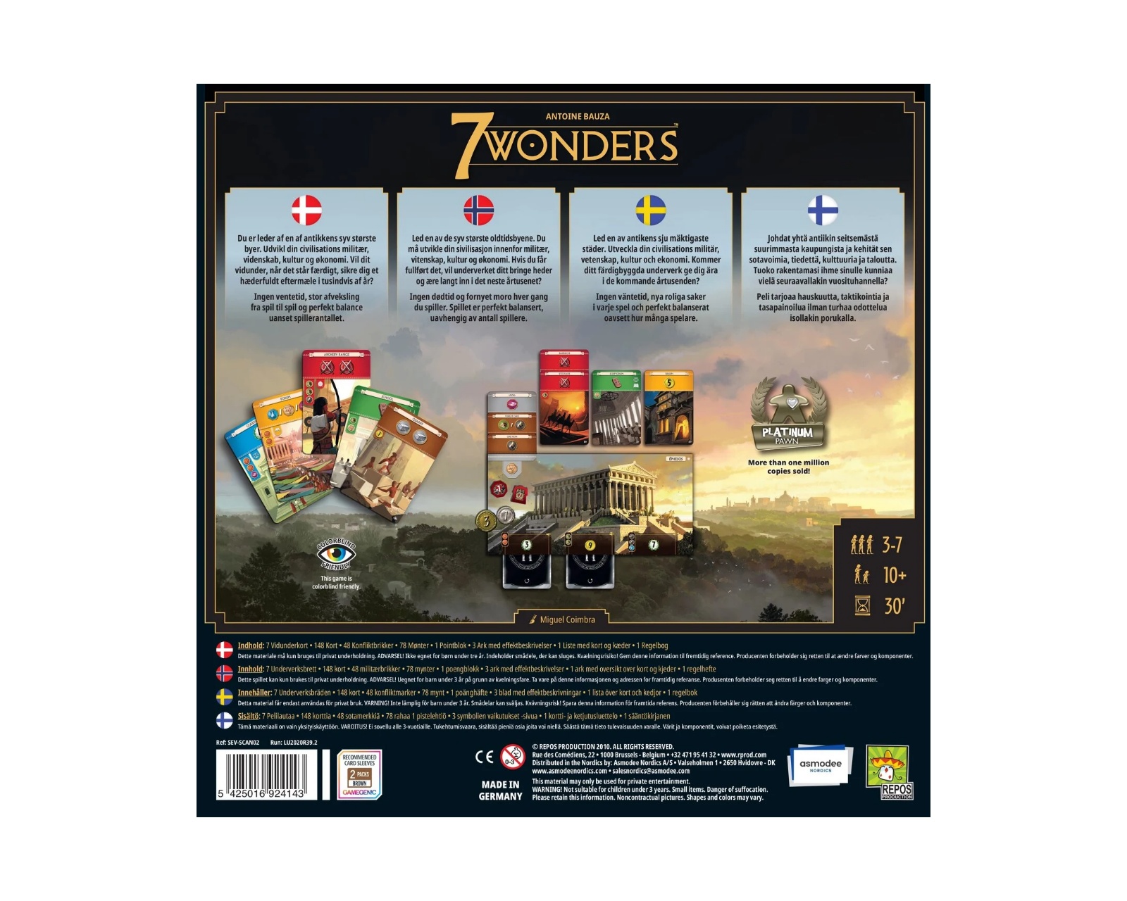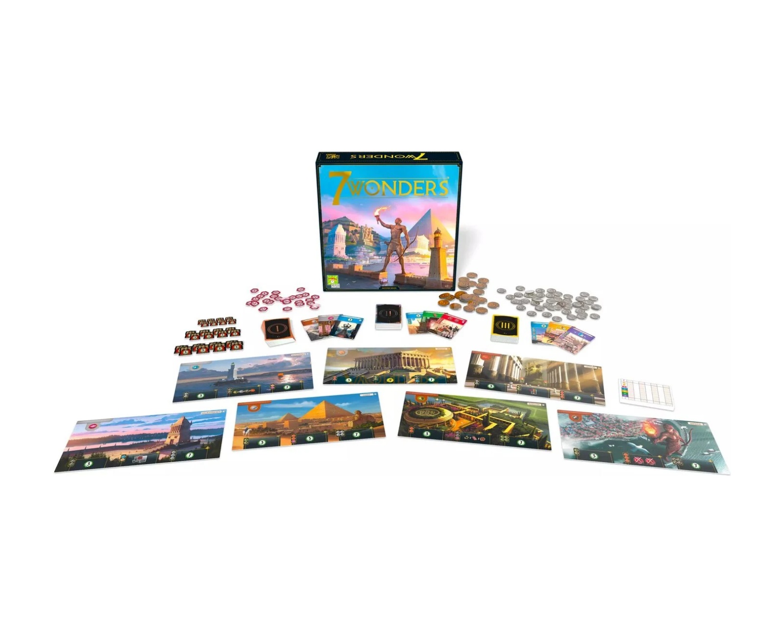 7 Wonders V2 on lautapeli, joka tarjoaa syvällisen ja strategisen kokemuksen, jossa pelaaja kehittää omaa sivilisaatiotaan. Pelissä on joukko erilaisia kortteja ja komponentteja, jotka ovat ratkaisevia sotilaallisen, tieteellisen, kulttuurisen ja taloudellisen rakentamisen kannalta. Se sisältää joukon ihme-lautoja ja aikakortteja, mikä tuo dynaamisen pelikokemuksen riippumatta pelaajamäärästä.Materiaalit 7 Wonders V2:ssä koostuvat korkealaatuisista korteista ja laudoista, mikä varmistaa kestävyyden monien pelisessioiden aikana. Sisältöön kuuluu 148 aikakorttia kolmessa aikakaudessa, mikä mahdollistaa pelaajien suunnitella siirtonsa strategisesti ja mukauttaa strategiaansa pelin edistymisen mukaan. Pelissä on 78 kolikkoa kahdessa arvossa, ja ne näyttelevät keskeistä roolia pelin taloudellisessa osuudessa. Lisäksi on 48 sotilaallista konfliktimerkkiä, jotka ilmestyvät pelin eri vaiheissa ja tuovat lisää syvyyttä strategiaan.
