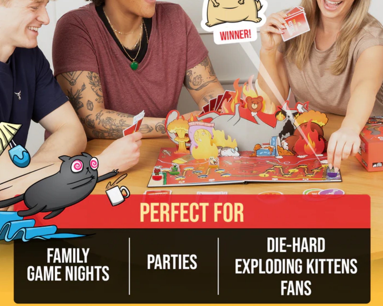 Exploding Kittens: Lautapeli - Super Fan Edition on lautapeli, joka yhdistää strategian ja onnen. Peli sisältää erikoiskortteja, interaktiivisen pelilaudan ja ainutlaatuisia hahmoja, mikä tuo uuden ulottuvuuden tunnettuun korttipeliin. Kohderyhmä koostuu sekä uusista pelaajista että alkuperäisen Exploding Kittens -korttipelin faneista.Lautapeli koostuu 65 Toimintakortista, 26 Siirtokortista, 2 ainutlaatuisesta kortista, pop-up pelilaudasta ja 6 deluxe-hahmosta. Interaktiivinen pelilauta voidaan kääntää, mikä paljastaa uuden pelikonseptin ja lisää jännitystä. Peli on suunniteltu 2-5 pelaajalle ja soveltuu hyvin pelivilloille, joissa tarvitaan nopeita vuoroja.