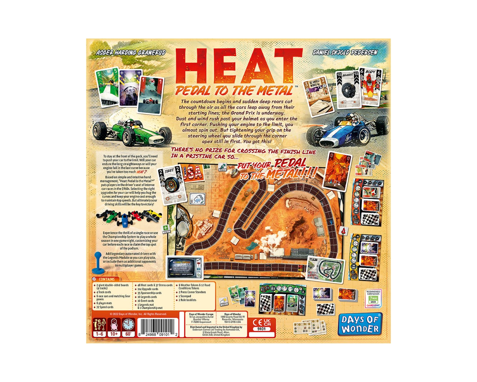 HEAT on lautapeli, joka tarjoaa helpon ja intuitiivisen korttien käytön sekä asettaa pelaajan kuljettajan paikalle kaaoottisissa autokilpailuissa 1960-luvulla. Pelaajat voivat valita yksittäisten kilpailujen tai mestaruussäännösten välillä pelatakseen koko kauden, ja jokainen kilpailu vaatii strategisia parannuksia autosta kurvien hallitsemiseksi ja moottorin viileänä pitämiseksi, mikä on keskeistä huippunopeuden saavuttamiseksi. Peli on suunniteltu 1-6 pelaajalle, mikä mahdollistaa joustavan pelaamiskokemuksen, riippumatta siitä pelaako yksin vai muiden kanssa.Pelien komponenttien yksityiskohdat on huolellisesti suunniteltu autenttisen pelikokemuksen luomiseksi. Autokortit edustavat erilaisia ajoneuvoja 1960-luvulta ja niissä on erityispiirteitä, jotka vaikuttavat pelin dynamiikkaan. Toteuttamalla legendaarisia automaattisia kuljettajia legendamoduulin kautta pelaajalle avautuu mahdollisuus laajentaa pelistrategiaansa ja kilpailukykyään, mikä tekee taktiikan säätämisestä loputtomia mahdollisuuksia.