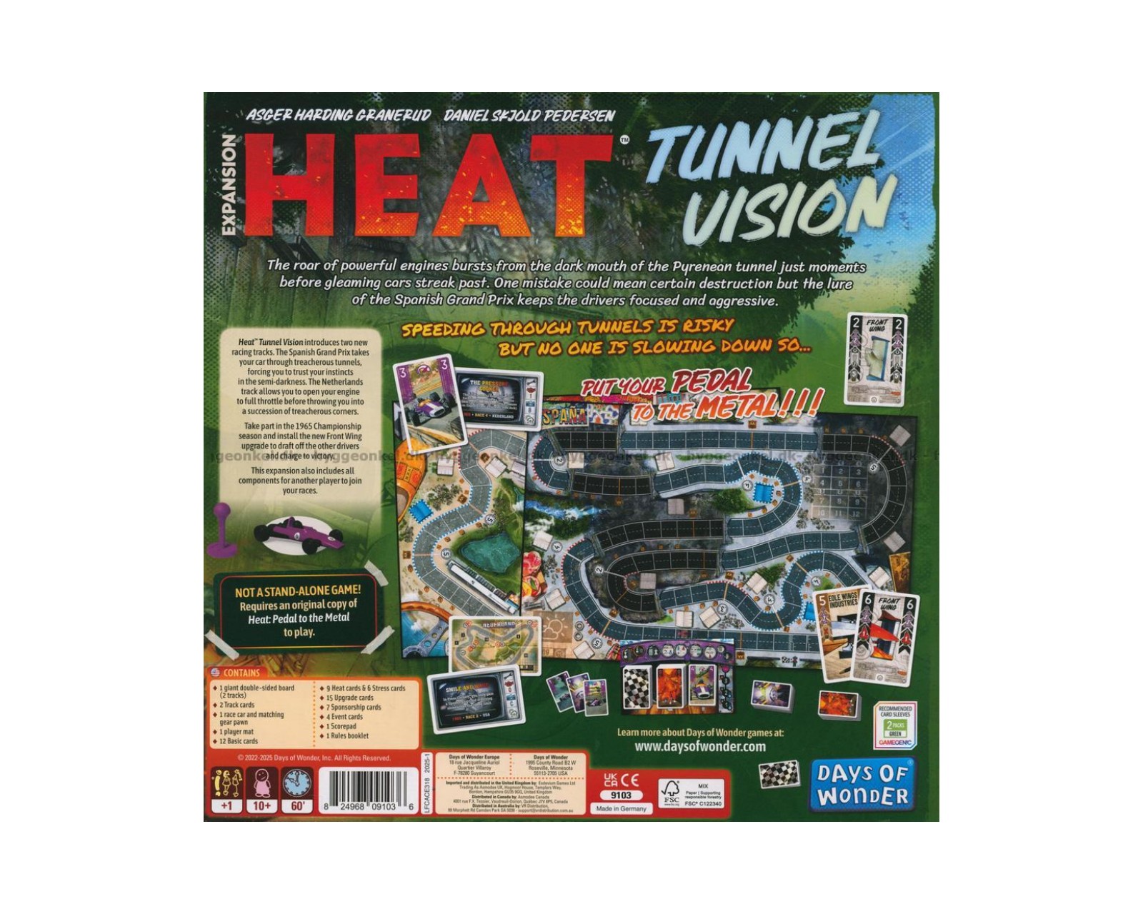 HEAT Tunnel Vision Expansion on NEVEntertainmentin lautapelitärvikem tuote, joka laajentaa HEAT-peliä. Tämä laajennus antaa pelaajille mahdollisuuden kilpailla vuoden 1965 mestaruudessa, erityisesti keskittyen sään vaikutuksiin, kuten sateeseen, joka asettaa ylimääräisiä haasteita kuskeille. Tässä julkaisussa esitellään kaksi uutta rataa: Espanjan Grand Prix -rata, jota leimaavat tunnelit, sekä Alankomaiden rata, jossa vauhti ja mutkien ottamisen taito ovat ratkaisevia menestyksen kannalta.Laajennuksen suunnittelu ottaa huomioon yksityiskohtaiset pelimekanismit vahvistaakseen 1960-luvun kilpailemisen intensiivistä tunnelmaa. Komponentit on valmistettu kestävästä materiaalista, joka kestää tiheää käyttöä ja tarjoaa aidon pelikokemuksen. Lisääntynyt keskittyminen sääolosuhteisiin syventää strategiaa, mikä tarkoittaa, että pelaajien on mukautettava strategioitaan ratojen ja sään vaikutusten mukaan pelin aikana.