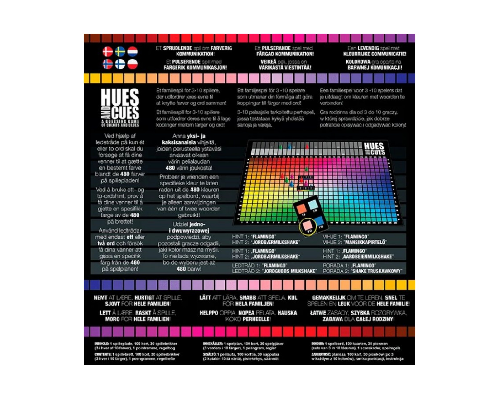 Hues And Cues on seurapeli, joka tarjoaa luovan ja viihdyttävän kokemuksen 3–10 pelaajalle. Peli keskittyy arvauksiin väreistä vihjeen avulla, joka on muotoiltu yhdestä tai kahdesta sanasta. Pelilautaa, joka sisältää peräti 480 värisävyä, käytetään dynaamisen ja mukaansatempaavan pelitilan luomiseen, jossa pelaajat yrittävät sijoittaa merkkinsä niin lähelle oikeaa sävyä kuin mahdollista. Peliaika on noin 30 minuuttia ja peli on suunniteltu 10-vuotiaista eteenpäin.Pelilauta on suunniteltu 480 värisävyn kanssa, mikä mahdollistaa värien syvällisen tutkimisen. Värit voidaan kokea eri tavalla eri yksilöiden toimesta, mikä luo mielenkiintoista keskustelua avaavaa. Pelisäännöt ovat saatavilla useilla pohjoisilla kielillä ja täydelliset komponentit, kuten värimerkit, sanavihje-kortit, pistekirjat ja kynät, tekevät pelaajille helpon pääsyn peliin. Materiaalien laatu keskittyy kestävyyteen ja pitkäaikaiseen käyttöön, mikä varmistaa luotettavan pelielämyksen toistuvissa pelikierroksissa.