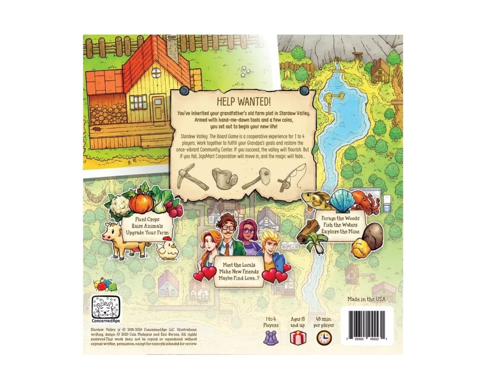 Stardew Valley - Lautapeli on yhteistyöhenkinen seurapeli Eric Baronelta, joka perustuu arvostettuun tietokonepeliin. Stardew Valleyssä on rikas ja elävä maailma, jossa pelaajat tekevät yhteistyötä palauttaakseen rappeutuneen laakson. Peli kannustaa strategiseen ajatteluun viljelemällä viljoja, kasvattamalla eläimiä ja laajentamalla maatilaansa. Yhteistyötä edistävän pelimekaniikan avulla tavoitteena on estää Joja Corporationin tunkeutuminen ja säilyttää laakson viehättävä yhteisö.Pelin sisältöön kuuluu erilaisia komponentteja, kuten pelilauta, sääntökirja, erikoiskortit ja pelimerkit, mikä mahdollistaa syvän ja vaihtelevaan pelikokemuksen. Ainutlaatuiset kyläläiskortit ja vuodenaikakortit tarjoavat pelaajille mahdollisuuksia hankkia etuja ystävyyden ja salaisen tehtävän kautta. Erilaiset nopat ja merkit auttavat myös luomaan dynaamisen pelimaailman, jossa jokaisella päätöksellä ja toiminnalla on merkitystä. Peliaika on noin 45 minuuttia pelaajaa kohden, mikä tekee siitä täydellisen aktiviteetin peli-iltoihin ystävien ja perheen seurassa.