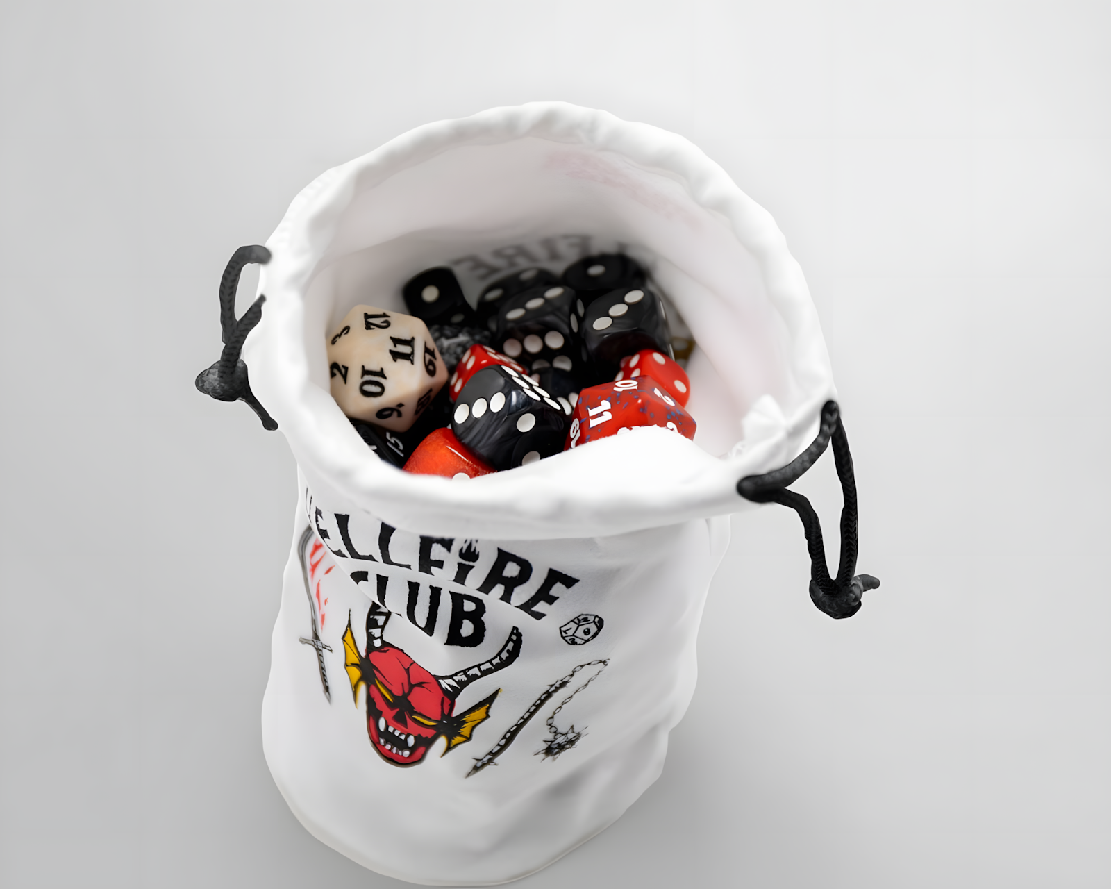 Stranger Things: Hellfire Club on Gamegenicilta peräisin oleva noppapussi, joka tarjoaa pehmeän ja ylellisen tunnun samettimaisen materiaalinsa ansiosta. Noppapussi on suunniteltu säilyttämään ja kuljettamaan yli 130 RPG-noppaa, mikä tekee siitä ihanteellisen käytettäväksi roolipeleissä, lautapeleissä ja korttipeleissä. Siinä on integroitu pohja, joka pitää pussin pystyssä, ja se sulkeutuu turvallisesti kiristysnyörillä estääkseen noppien putoamisen.Noppapussi on valmistettu synteettisestä tekstiilimateriaalista ja sen mitat ovat 90 x 170 mm. Se on suunniteltu toimivaksi ja helposti saatavaksi erilaisissa pelitilanteissa. Sarjasta Stranger Things™ peräisin oleva ikoninen Hellfire Club -kuvio tuo mielenkiintoisen visuaalisen ulottuvuuden ja yhteyden populaarikulttuuriin. Pakkaus koostuu pahvilaatikosta, joka suojaa sisältöä.