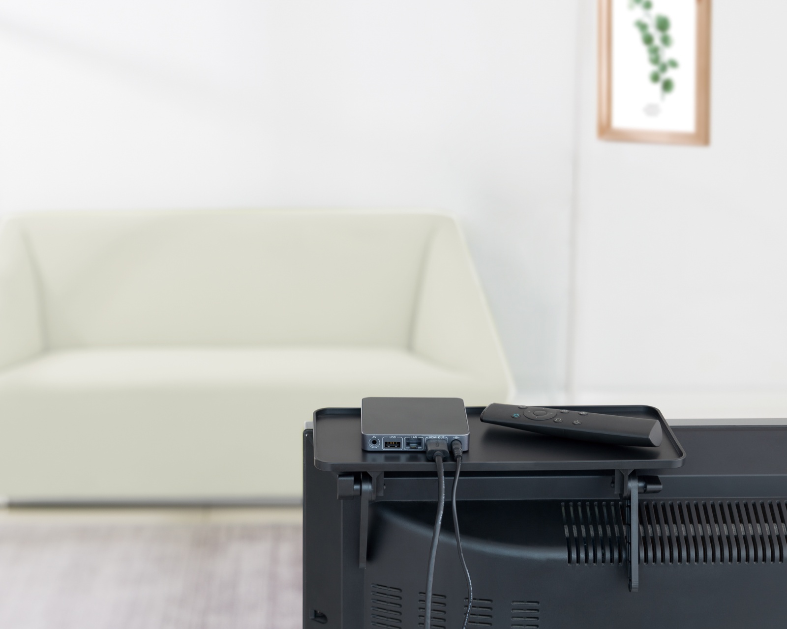 Toppamonttuinen mediahylly TV:lle MaxMountilta on ratkaisu median laitteiden tehokkaaseen sijoittamiseen TV:n ylle. Hylly on suunniteltu yhteensopivaksi TV-mallien kanssa, joissa on paksuus yli 18 mm, ja se tarjoaa etäisyyden seinästä yli 127 mm. Tuotteen kantokyky on jopa 6 kg ja mitat 300 mm x 127 mm tarjoavat runsaasti tilaa kauko-ohjaimille ja mediasoittimille.Hyllyn ympärillä olevat suojaavat reunat estävät esineitä putoamasta, mikä auttaa luomaan järjestelmällisen ja turvallisen ympäristön mediaan liittyville laitteille. Helposti asennettavan muotoilun ja käytännöllisen lukitusnapin ansiosta hyllyn asentaminen on vaivatonta, mikä säästää aikaa ja helpottaa käyttöä. Musta pinta sopii useimpiin koti- ja toimistoympäristöihin, joten se on ihanteellinen pelaajille ja harrastajille, jotka arvostavat sekä toiminnallisuutta että estetiikkaa.
