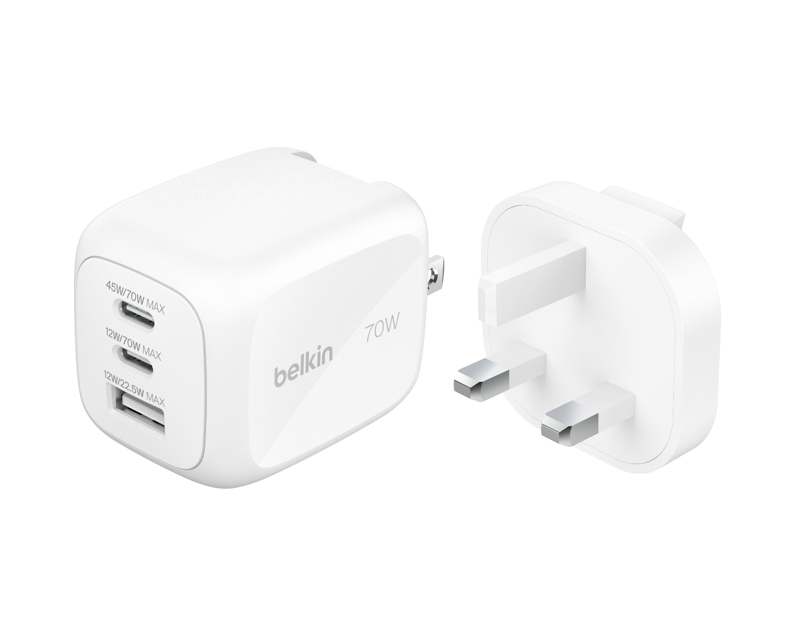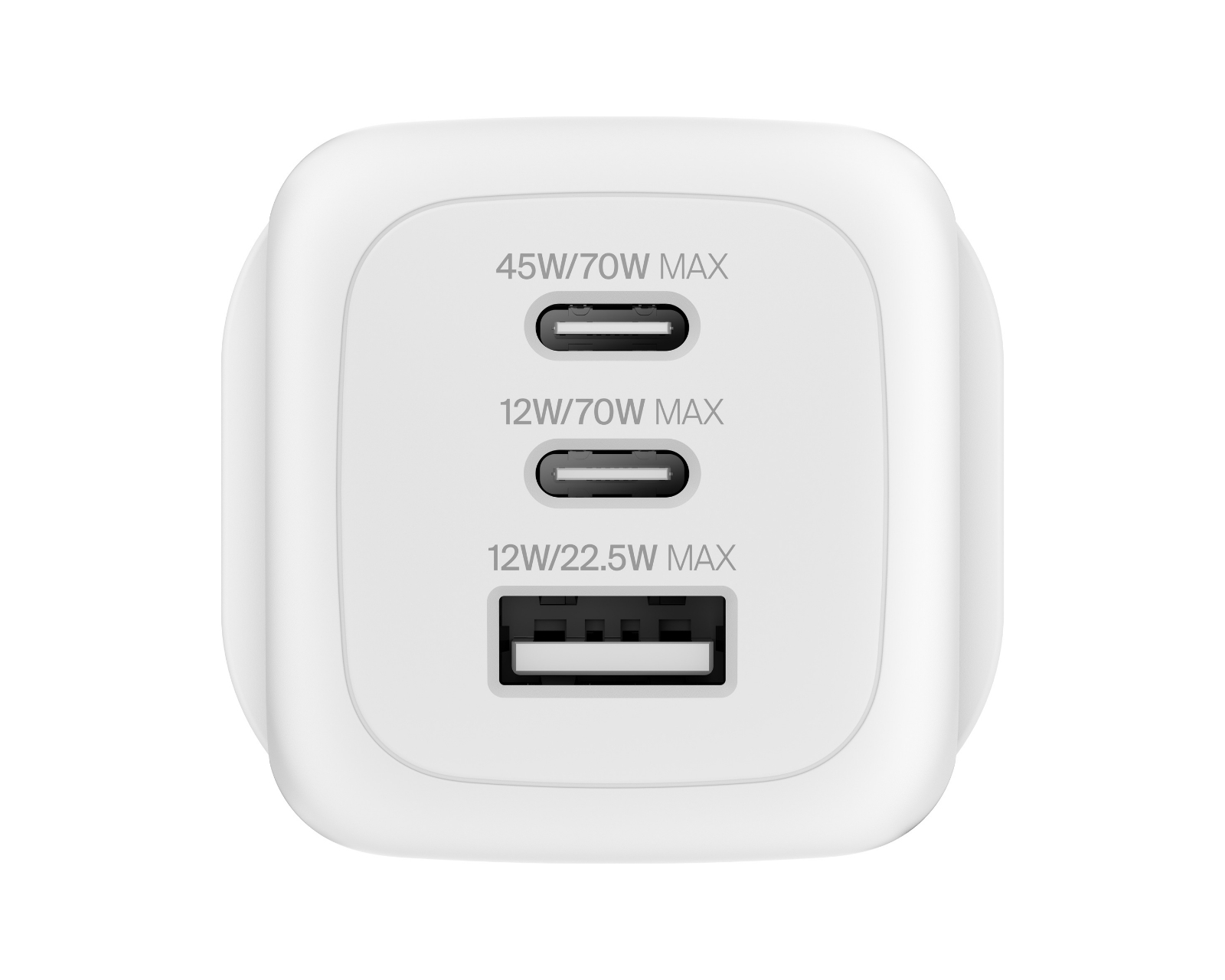 BOOSTCHARGE 70 W on Belkinin GaN-laturiseina, jossa on kolme porttia, mukaan lukien 2 USB-C ja 1 USB-A. Se tukee nopeaa lataamista useille laitteille, kuten MacBookille, iPhonelle ja Samsung Galaxylle. Laturi on suunniteltu käytettäväksi eri maantieteellisillä alueilla vaihdettavilla liittimillä USA:ta, UK:ta ja EU:ta varten.Tämä laturi on rakennettu GaN-tekniikalla, mikä mahdollistaa korkean tehokkuuden ja alhaisemman lämmöntuoton latausprosessin aikana. Yhteensä 70 watin lähtöteho means that the laturi voi tarjota nopeaa latausta sekä älypuhelimille että kannettaville tietokoneille. USB-C PD3.1 -tekniikkaa käytetään laitteiden, kuten iPhone 16, lataamiseen 0:sta 50 %:iin vain 27 minuutissa ja MacBook Airin lataamiseen 41 minuutissa. Se on myös yhteensopiva monenlaisten laitteiden, kuten Chromebookin, iPad Pron ja Google Pixelin kanssa. Teknisten tietojen mukaan laturia voidaan käyttää jopa kolmen laitteen lataamiseen samanaikaisesti, mikä tarjoaa pelaajille ja muille käyttäjille tehokkaan ratkaisun, kun useat laitteet tarvitsevat latausta.