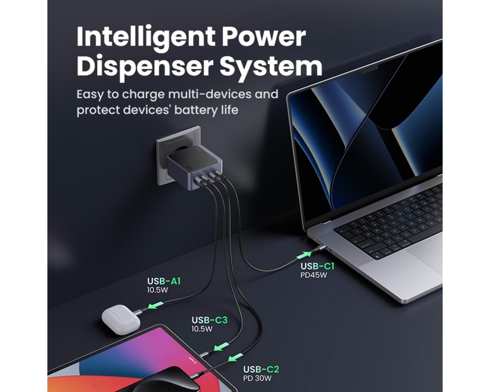 Nexode S 100W 4-portti on seinälaturi, jolla voit ladata laitteesi nopeasti. Edistyneen latausteknologian avulla voit ladata älypuhelimesi, tablettisi tai muita elektronisia laitteita tehokkaasti ja luotettavasti. Älykkään ylikuumenemissuojan ansiosta voit olla varma, että laitteesi latautuvat nopeasti ja turvallisesti. Varmista, että olet aina valmis päivään täyteen ladatuilla laitteilla, jotka pitävät sinut yhteydessä ja tuottavasti koko päivän.Nexode S 100W:ssa sinulla on käytettävissä neljä liitäntäporttia, joiden avulla voit helposti pitää kaikki laitteesi täyteen ladattuina ja käyttövalmiina, kun tarvitset niitä. Näiden porttien avulla voit ladata älypuhelimesi, tablettisi, kannettavasi ja muita laitteitasi samanaikaisesti, mikä on täydellinen digitaalisen arjen tehokkaaseen hallintaan.