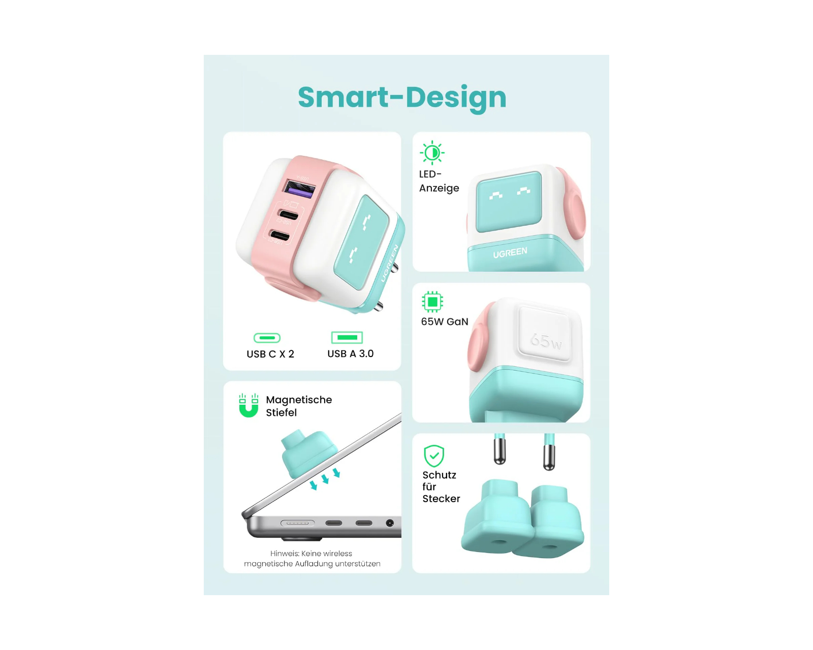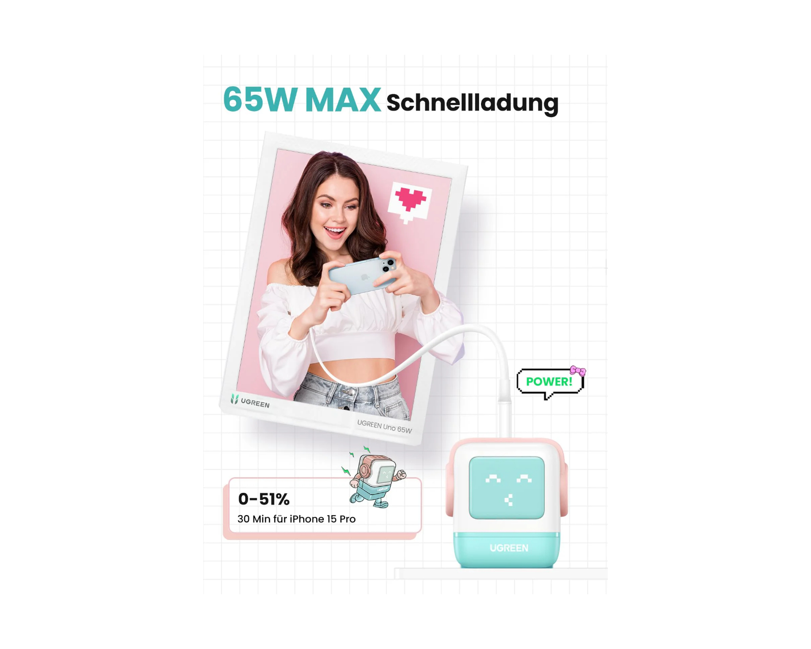 Uno Robot GaN on tehokas ja kompakti pikalaturi, joka on varustettu kolmella latausportilla ja sopii täydellisesti useiden laitteiden lataamiseen samanaikaisesti. Siinä on kaksi USB-C-porttia, joista toinen tarjoaa jopa 65 W:n maksimitehon, joka sopii ihanteellisesti kannettavien tietokoneiden, tablettien ja muiden virtaa vaativien laitteiden lataamiseen, kun taas toisen maksimiteho on 30 W, joka on täydellinen älypuhelimille ja pienemmille laitteille.
