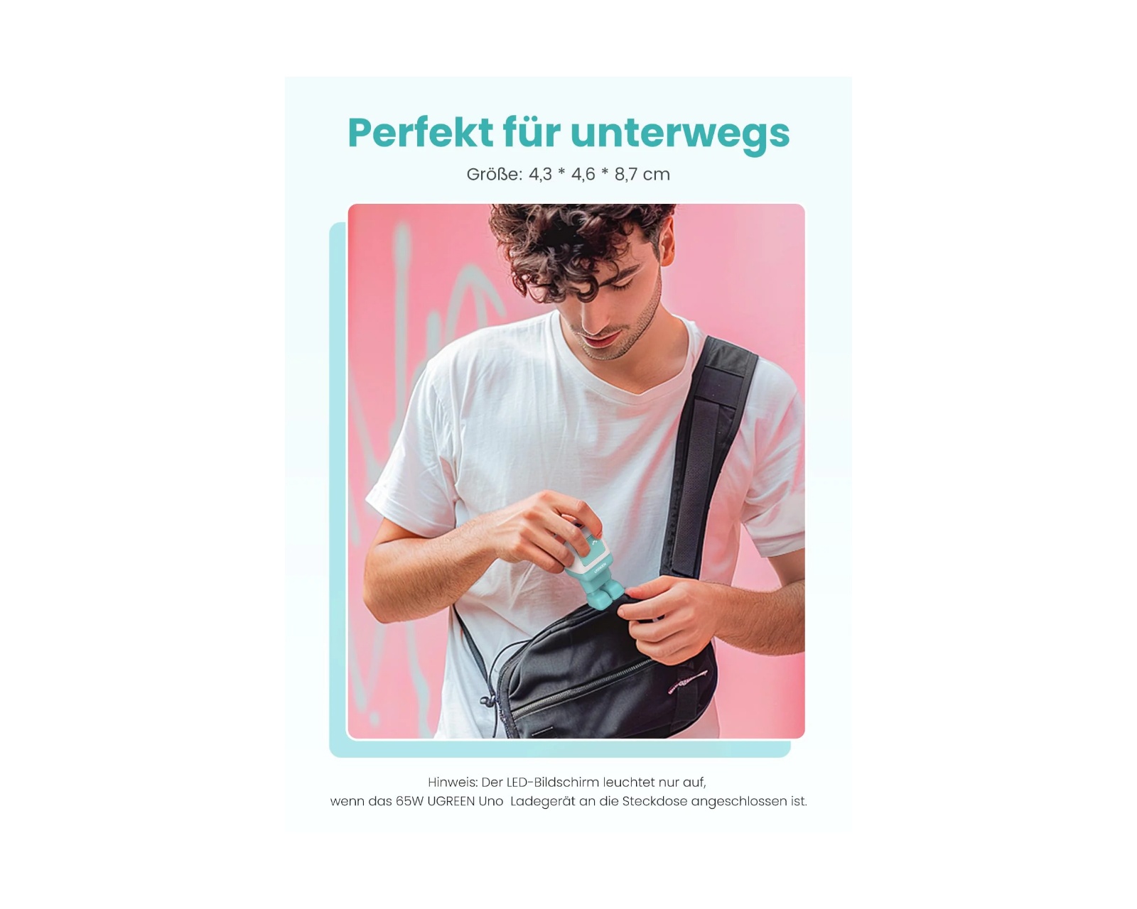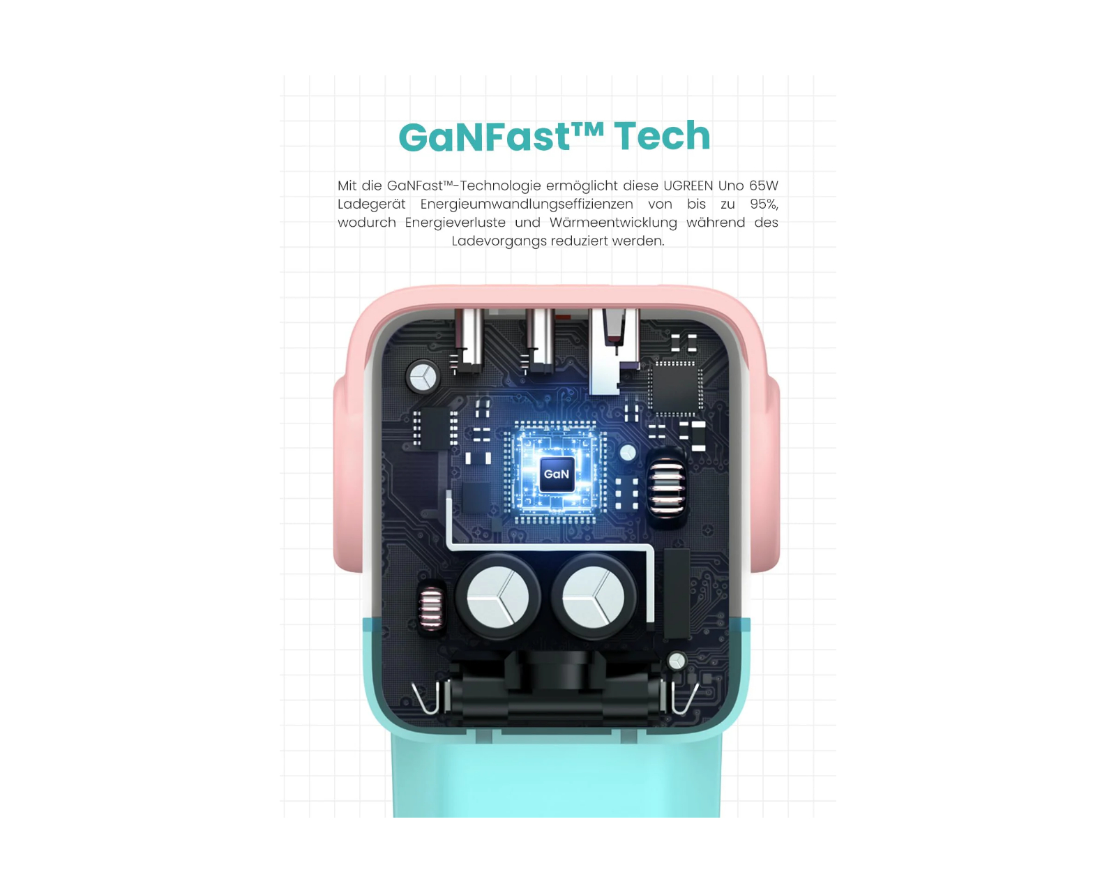 Lisäksi on USB-A-portti, jonka maksimiteho on 22,5 W, mikä helpottaa vanhempien tai vähemmän virtaa vaativien laitteiden lataamista. Suurin kokonaislähtöteho on 65 W, mikä varmistaa nopean ja tehokkaan latauksen kaikille laitteillesi.