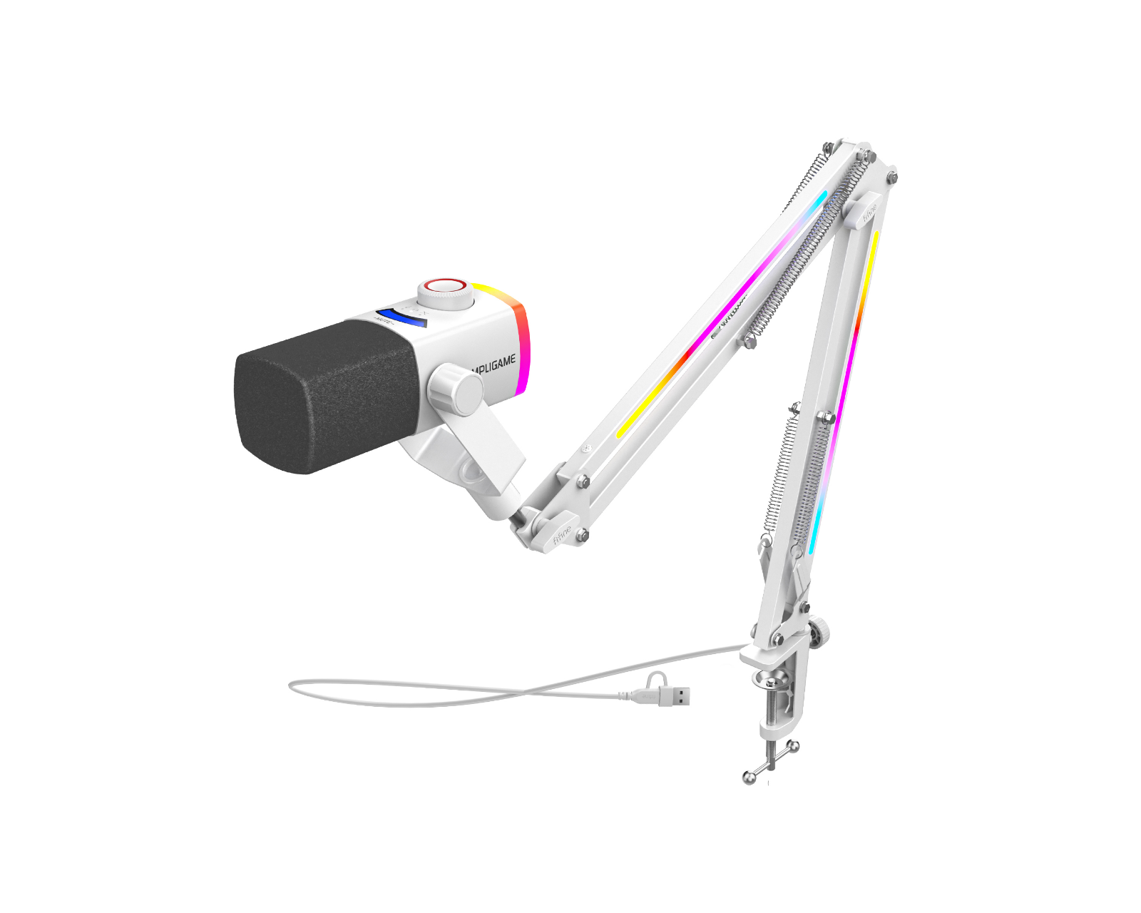 AmpliGame AM8PROT on Fifinen suunnittelema mikrofonija boom-teline, joka on kehitetty tuottamaan korkealaatuista äänen tallennusta. Se tukee sekä USB- että XLR-liitäntöjä joustavuuden vuoksi. Dynamiikkamikrofonielementti ja kardioidipolariteetti keskittyvät ääneen lähteestä ja minimoivat taustamelua.AmpliGame AM8PROT on rakennettu korkealaatuisista komponenteista ja tarjoaa 75 dB signaali-kohinasuhteen. Sen maksimikohina-taso on 115 dB ja se tukee sekä 16- että 24-bittistä bittinopeutta, mikä tarjoaa selkeää ja yksityiskohtaista äänen toistamista. Siinä on 3-in-1 säätönuppi mikrofonin vahvistuksen, kuulokkeen äänenvoimakkuuden ja mikrofonin sekä tietokoneäänen sekoittamiseen. RGB-valaistus yli 240 vaihtoehdolla luo visuaalisen kokemuksen, joka voidaan synkronoida äänen kanssa.