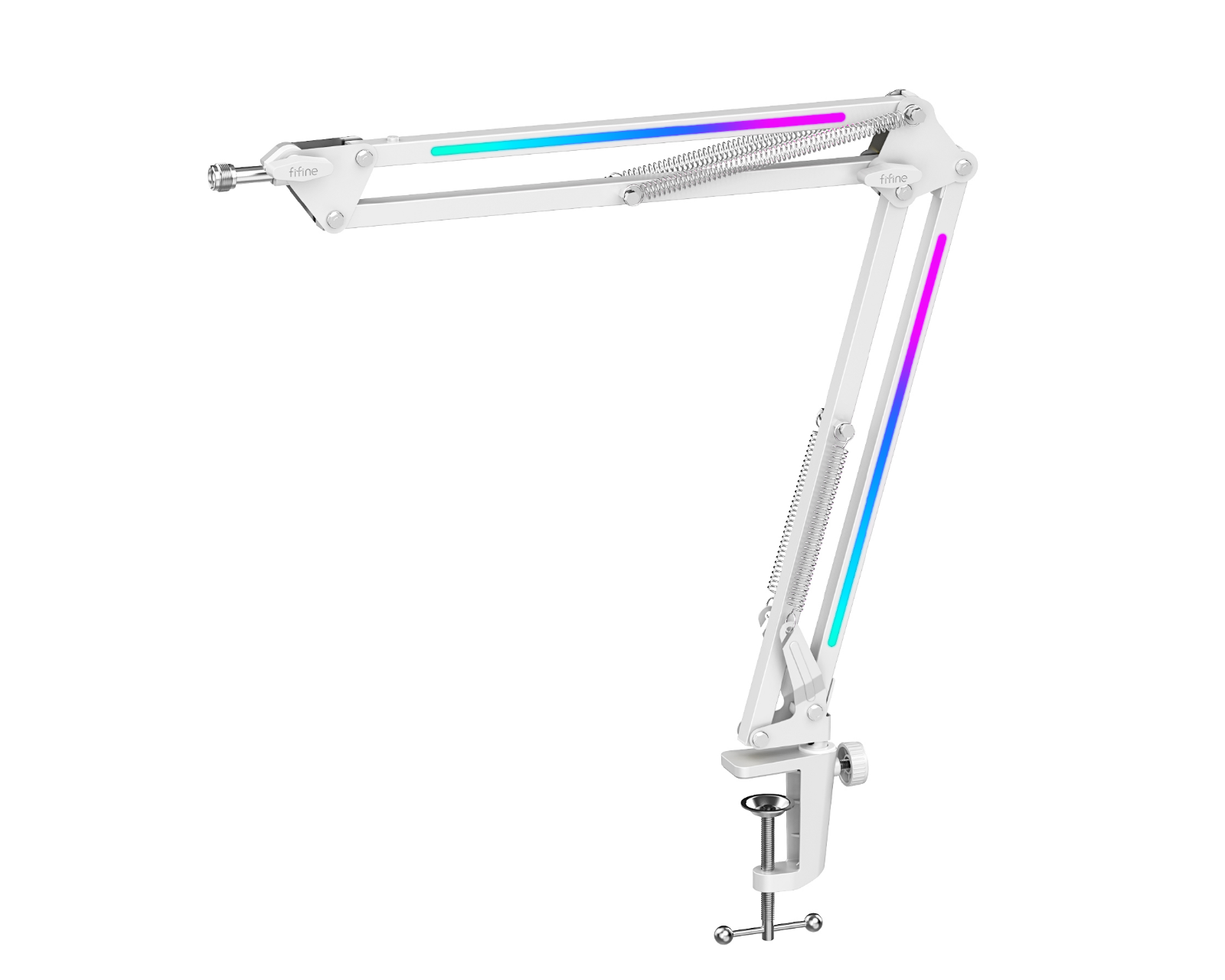 BM38 RGB Metalli Mikrofonituki on FIFINEn mikrofonituki, joka tarjoaa säädettävän sijoittamisen ja RGB-valaistuksen parannetun käyttökokemuksen vuoksi. Se on valmistettu paksusta teräksestä, joka takaa vakauden ja pystyy tukemaan mikrofoneja, jotka painavat jopa 1,5 kg. Se on suunnattu pelaajille ja podcastaajille, jotka etsivät joustavaa ja kestävää ratkaisua mikrofoneilleen.Mikrofonituki on valmistettu vahvistetusta teräksestä ja suunniteltu kestämään intensiivistä käyttöä ilman, että vakaus heikkenee. RGB-valot voidaan säätää tuen päällä olevalla napilla, mikä antaa käyttäjälle mahdollisuuden vaihtaa yli yhdeksän värivaihtoehdon välillä. Lisäksi tuessa on 180° joustava osio ja 360° kääntöosa, jotka mahdollistavat mikrofonin tarkan säädön. Asennus on työkaluvapaa, eikä se vahingoita pöytää silikonipatjan ansiosta kiinnikkeessä. Tuote on myös yhteensopiva useimpien mikrofonien kanssa mukana tulevan 3/8” ja 5/8” kierteisen sovittimen avulla.