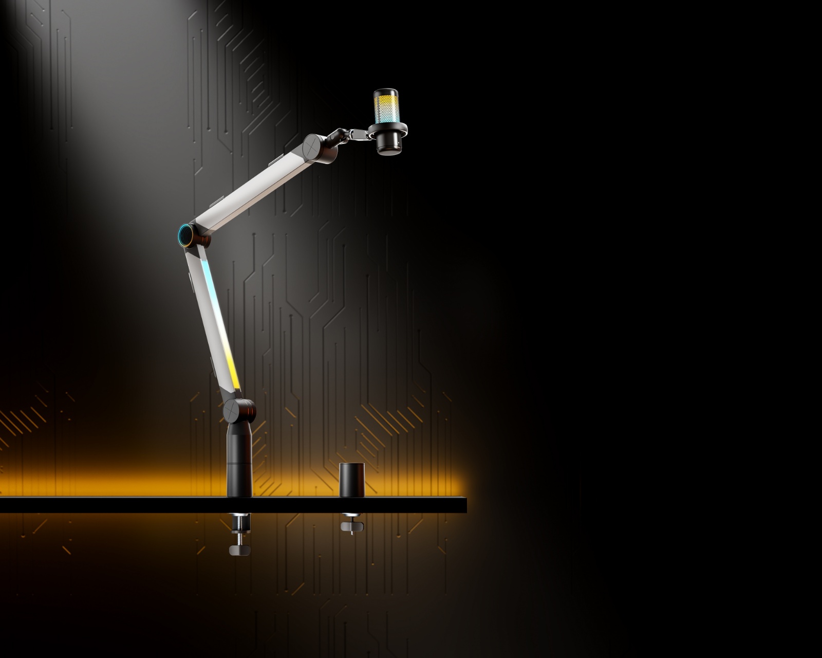 Alumiininen dynaaminen RGB-mikrofoniteline on MaxMountin premium-mikrofoniteline, joka on suunniteltu parantamaan sekä ammattilaisten pelata että striimausympäristöjä. Integroitu äänenvoimakkuuden säätö mahdollistaa käyttäjän säädellä järjestelmän äänenvoimakkuutta helposti, kun taas ainutlaatuinen muotoilukonsepti, jossa on äärettömyyspeili nivelissä ja RGB-nauhat alhaalla olevassa varsiosassa, luo silmiinpistävän visuaalisen efektin. Mikrofonivarsi on rakennettu kestävyydelle ja vakaudelle, yhdistäen luotettavan suorituskyvyn moderneihin esteettisiin piirteisiin tarjotakseen korkealaatuisen ratkaisun sisällöntuotantoon ja live-tuotantoon.Mikrofonivarsi on valmistettu laadukkaista materiaaleista, kuten alumiinista, muovista ja teräksestä, mikä takaa kestävän rakenteen. Sen maksimipainokapasiteetti on 1,5 kg ja korkeussäätö jopa 1028 mm, joten käyttäjä voi helposti mukauttaa varren sijaintia optimaalisen mukavuuden saavuttamiseksi suoratoiston aikana. Dynaaminen RGB-valaistus luo eloisia väri-efektejä, joita voidaan mukauttaa tunnelman mukaan. Kaapelinhallinta pitää kaiken järjestettynä ja siistinä, ja 3/8" ja 5/8" -sovittimien ansiosta mikrofonivarsi on yhteensopiva useimpien standardimikrofonien kanssa.