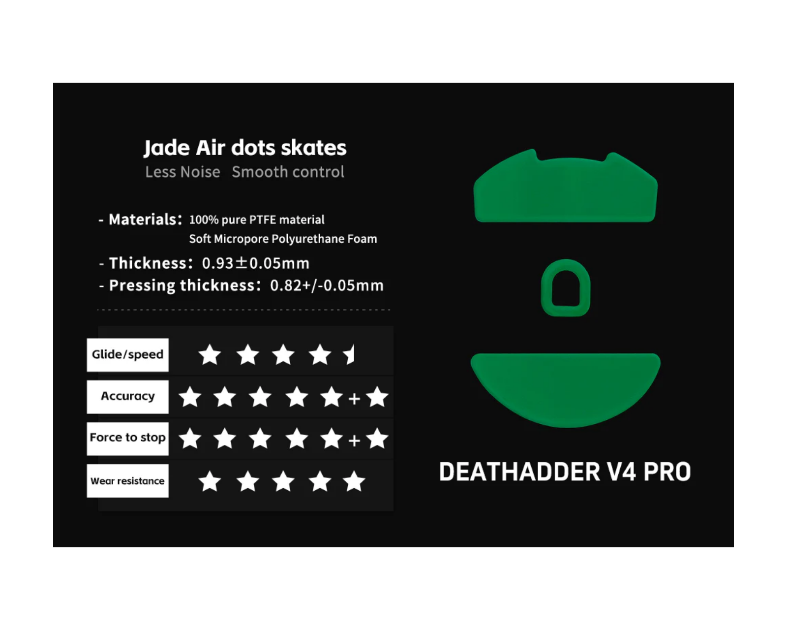 Jade Air Skates ovat X-raypadin valmistamia hiirimattoja, jotka on suunniteltu Razer Deathadder V4 Pro:lle. Nämä liukumaatsit tarjoavat pehmeän ja hiljaisen hallinnan ja ne on valmistettu PTFE-materiaalista, joka antaa sileän pinnan ja tarkat mitat, jotka mahdollistavat hiiren liikkua sujuvasti. Liukumaatsit ovat yhteensopivia sekä kangas- että muovihiirimattojen kanssa, mikä tekee niistä monipuolisia eri käyttöskenaarioissa.Materiaalivalinta ja rakennelaatu parantavat käyttäjäkokemusta vähentämällä käyttöön liittyvää melua. Vakaa ja hallittu liuku helpottaa tarkkuutta pelaamisessa sekä toimistotyössä. Paketti sisältää kaksi settiä liukumaatsia, kaksi alkoholiäreetä ja kaksi puhdistusliinaa liiman poistamiseksi, mikä helpottaa asennusta ja ylläpitoa.