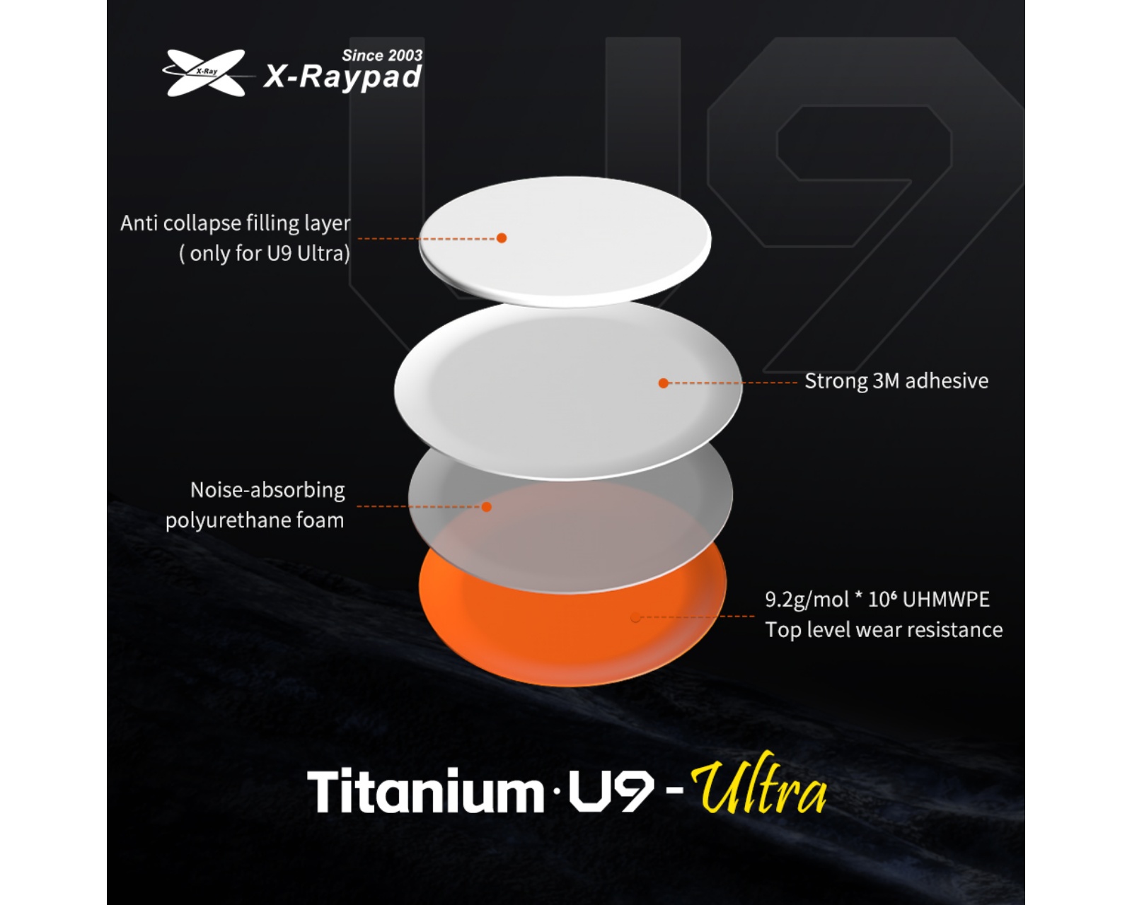 X-raypadin U9 Ultra 8 mm:n pistemäiset hiirimatot yhdistävät kestävyyden vakaaseen suorituskykyyn. Nämä hiirimatot on optimoitu lasipinnoille ja ne ovat yhteensopivia myös kangashiirimattojen kanssa. Ne on valmistettu erittäin korkean molekyylipainon omaavasta polyeteenistä (UHMWPE) monikerroksisessa rakenteessa, mikä takaa tasaisen tähtäyksen ja luotettavuuden jokaisella liikkeellä.Materiaali on erittäin kestävää ja tarjoaa pitkän käyttöiän erilaisilla pinnoilla. Luistimet on suunniteltu vähentämään heilumista ja tarjoamaan pelaajalle vakaan ja sujuvan käyttökokemuksen. Liikkuvuutta lisää huolellisesti suunniteltu muotoilu, joka sisältää myös melua vähentävän kerroksen, joka vähentää liukumisääntä ja antaa käyttäjälle paremman keskittymisen peliin. U9 Ultra on erityisesti mukautettu lasipinnoille, mutta se toimii erinomaisesti myös kangaspinnoilla.