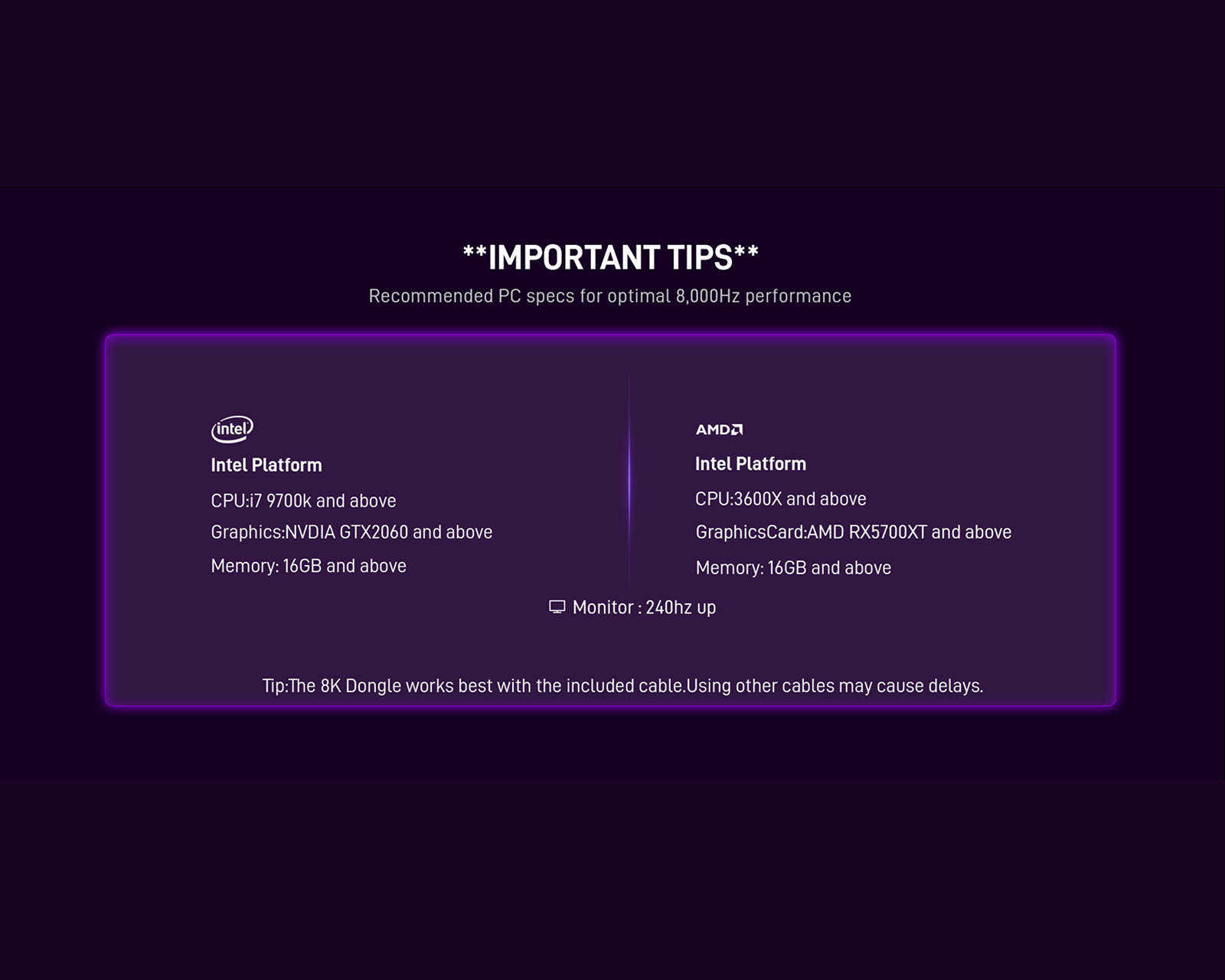8K II Dongle LAMZUlta mahdollistaa jopa 8000 Hz:n päivittämisnopeuden, mikä mahdollistaa nopean ja responsiivisen käyttökokemuksen. Se tarjoaa merkittävän lisääntyneen datasiirron, mikä on erityisen edullista korkeiden päivittämisnopeuksien peleissä. Dongle on suunniteltu tarjoamaan etumatka FPS- ja MOB-peleissä toimittamalla mikrosekuntitasoisia vasteaikoja.Laite mahdollistaa käyttäjien yksinkertaisen liittämisen selainpohjaisella, yhden napin asetuksella. Käyttämällä mukana tulevaa kaapelia se maksimoi suorituskyvyn ja tarjoaa 8000 Hz:n kyselynopeuden.