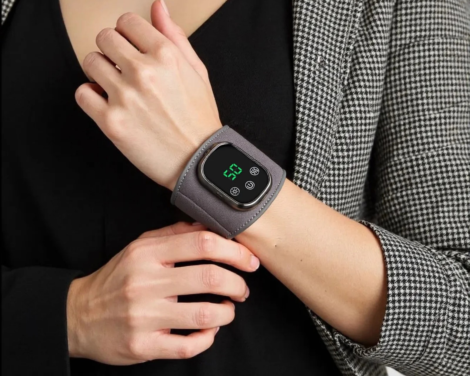 - Langaton ranneke, jossa on lämpö- ja värinähieronta