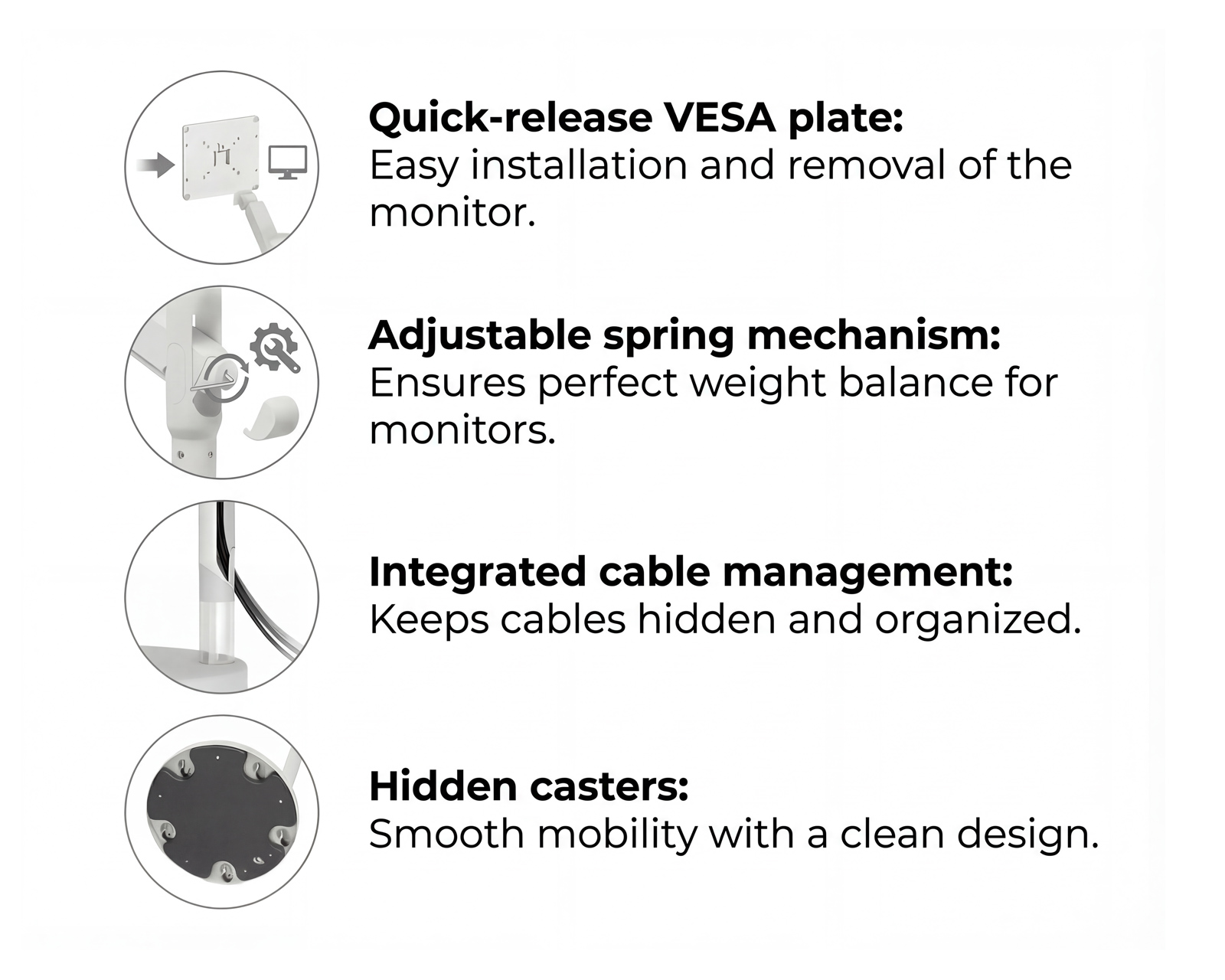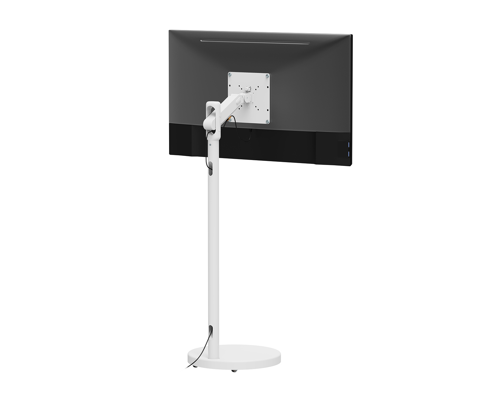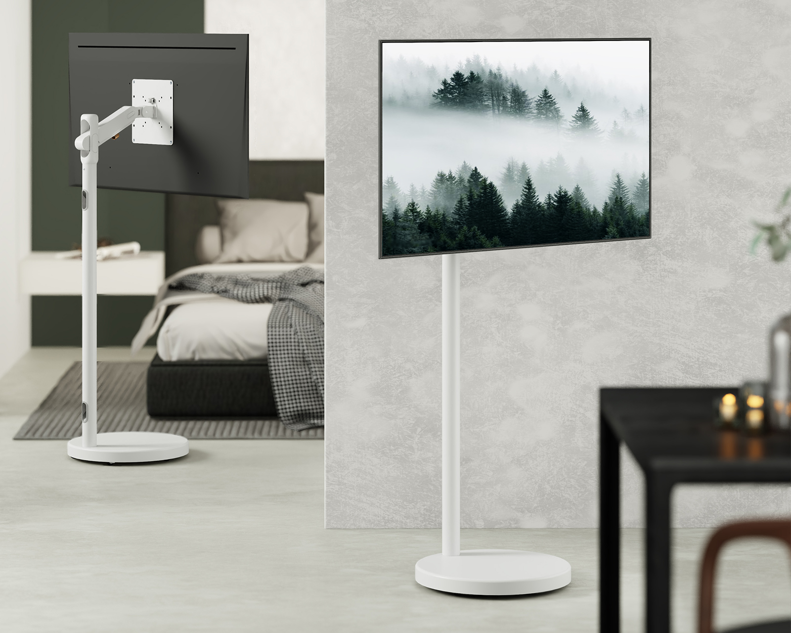 Golvstativ TV:lle MaxMountilta, joka tarjoaa optimaalista joustavuutta sekä toimisto- että kotikäyttöön. Tuen 17–43 tuuman näyttöjä ja enimmäispainon 17 kg näyttöä kohti, se on monipuolinen vaihtoehto kaikille, jotka etsivät vakaata ja säädettävää ratkaisua. Säädettävä jousivarsi helpottaa korkeuden ja kallistuksen säätämistä täydellisen katselukulman saamiseksi.Teline on valmistettu korkealaatuisista materiaaleista, kuten muovista ja alumiinista, mikä takaa sekä kestävyuden että keveydet. Suunnittelussa on huomioitu esteettisyys, ja se sisältää myös integroidun kaapelihallinnan, joka pitää kaapelit järjestyksessä ja piilossa. Tämä antaa siistin ja ammattimaisen ilmeen, joka on erityisen tärkeää työympäristöissä. Suuri kiertokyky +180° ja -180° sekä kallistus +75°:stä -45°:een mahdollistavat säätämisen eri katselukulmiin. Piilossa olevat pyörät telineen alla tekevät sen siirtämisestä helppoa ilman vakauden heikentämistä.