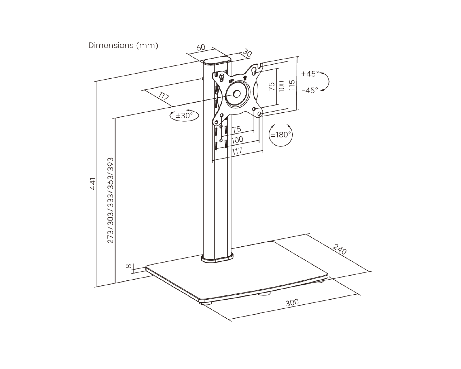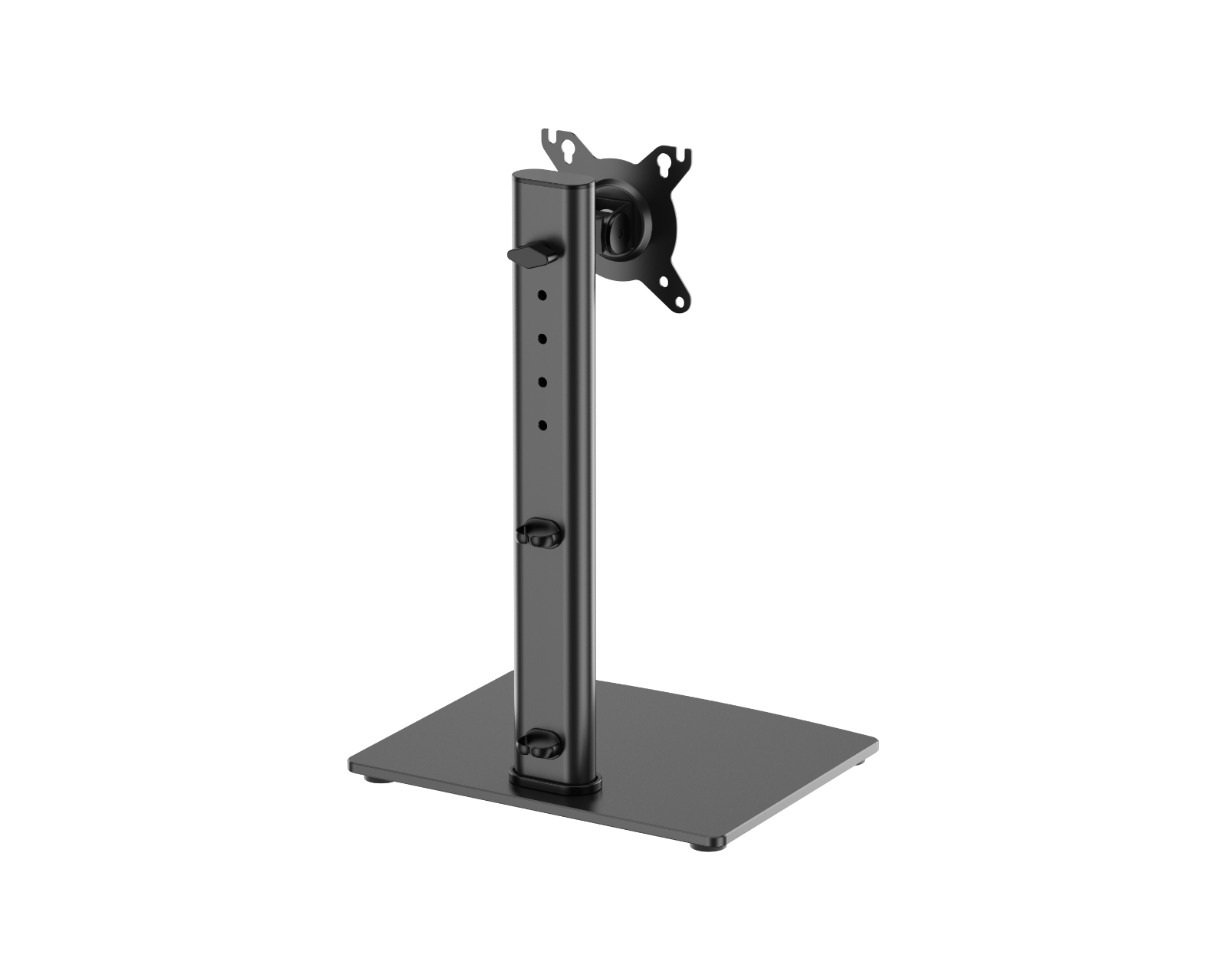Vertikaalinen Näyttöteline 17"-34" 12 kg – Musta on MaxMountin valmistama monitoriteline, joka on suunniteltu tukemaan 17–34 tuuman näyttöjä. Teline tarjoaa useita korkeus säätömahdollisuuksia ja siinä on vakaa rakenne, jossa on turvalukko lisäturvaa varten. Karkaistusta lasista valmistettu uskomattoman vakaa jalusta tarjoaa sekä toimivan että tyylikkään ratkaisun moderneille työpisteille. Kompakti pakkaus helpottaa kuljetusta ja tekee siitä ihanteellisen sekä verkkokauppatilauksiin että bulkkitilauksiin.Näyttötelineen rakennelaatu on vaikuttava, koostuen karkaistusta lasista ja teräksestä, mikä edistää sekä kestävyys että tyyli. Integroitu korkeuden säätö on suunniteltu mahdollistamaan nopean ja helpon säädön ilman työkaluja, mikä maksimoi käyttäjäystävällisyyden. 360° kääntyvä VESA-teline tukee eri katselukulmia, mikä parantaa ergonomiaa käytön aikana. Lukittava säätönappi varmistaa, että näyttö pysyy paikallaan kaikissa säädöissä. Lisäksi telineessä on kallistumismahdollisuus, mikä mahdollistaa katselukulman säätämisen nopeasti ja tehokkaasti. Kaapelin hallinta helpottaa järjestystä ja puhdasta työtilaa.