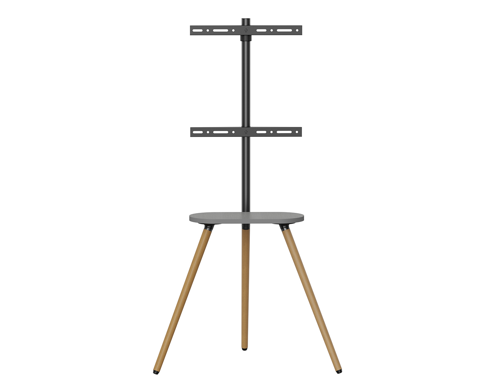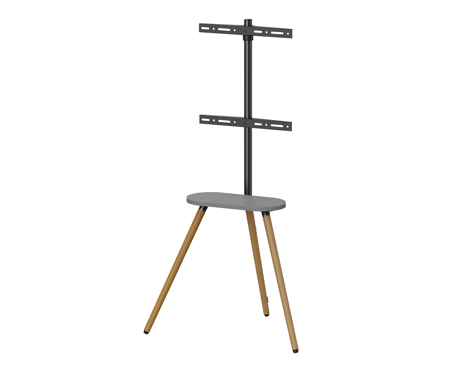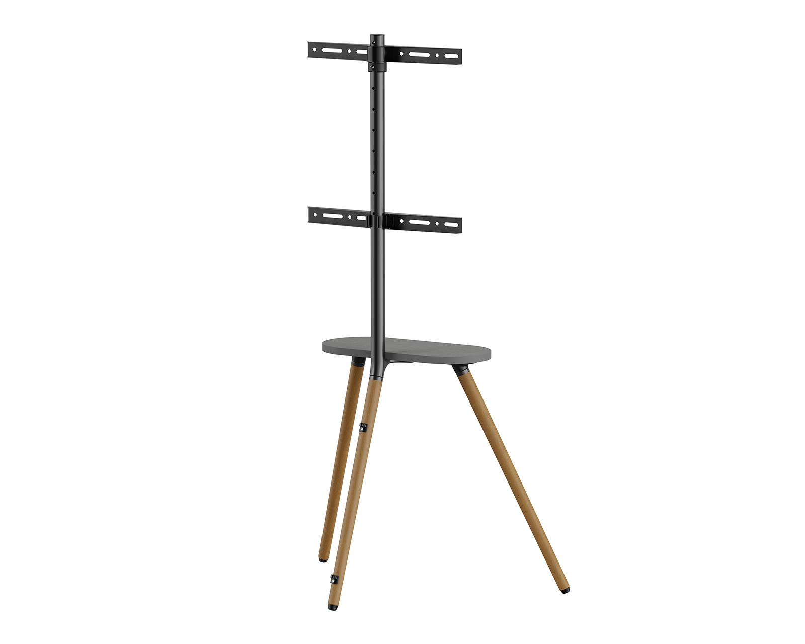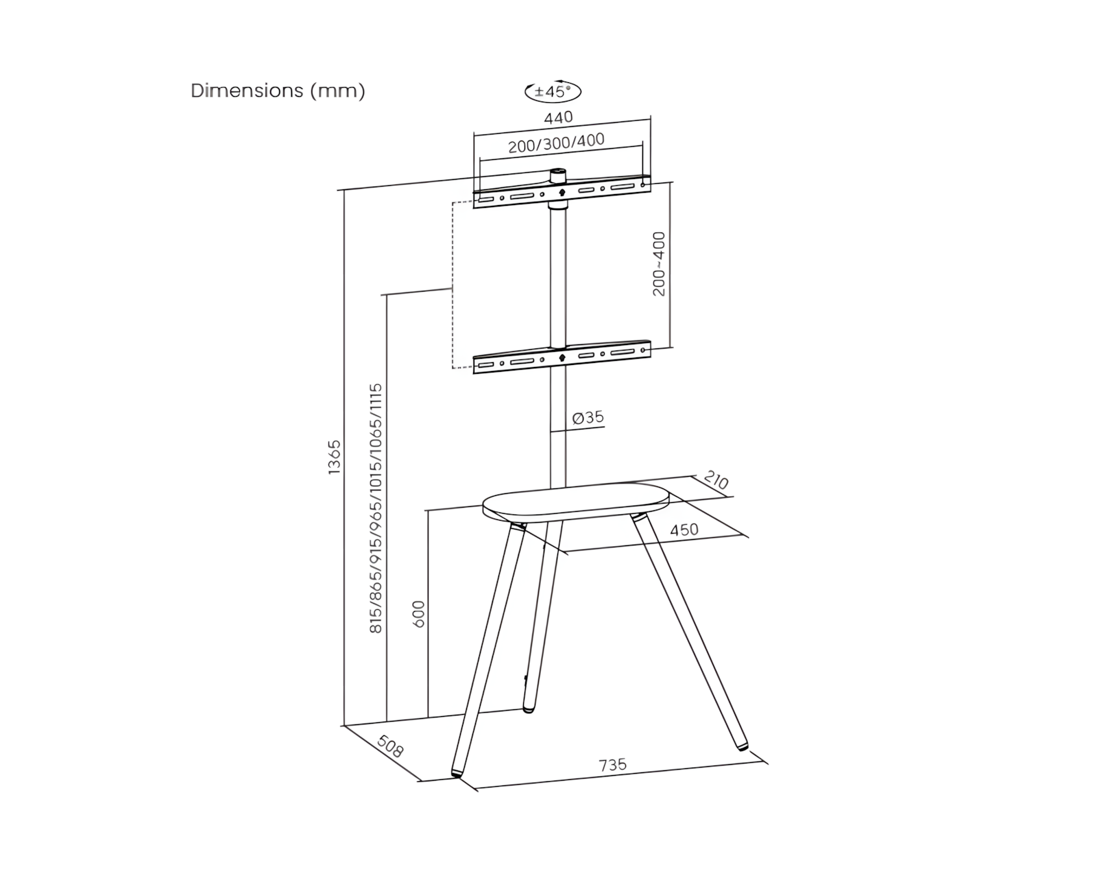 Tripod Stativ MaxMountilta yhdistää tyylin ja toiminnallisuuden. Se on suunniteltu tarjoamaan mukavaa katselukokemusta, täydellinen kotiteattereihin, toimistoihin ja näyttelykeskuksiin. Kääntyvän näytön avulla, joka liikkuu +45°:sta -45°:een, voit helposti säätää kulmaa yleisösi tarpeiden mukaan. Kiiltävä melamiinitaso sijaitsee suoraan television alla ja tarjoaa käytännöllistä säilytystilaa kaukosäätimille, kannettaville kaiuttimille ja muille pienille esineille.Statiivi on valmistettu kestäviä materiaaleja, mukaan lukien terästä, alumiinia ja melamiinia, mikä takaa vakauden ja kantokyvyn jopa 35 kg. Kompaktilla mitoituksella 735x508x1365 mm se sopii 43-65 tuuman näyttöihin ja on VESA-yhteensopiva helppoa asennusta varten. Integroitu kaapelinhallintajärjestelmä pitää kaapelit järjestyksessä ja pois tieltä, mikä edistää siistiä ja puhdasta asennusta. Mukana olevat turvaominaisuudet varmistavat, ettei stativi kaadu.
