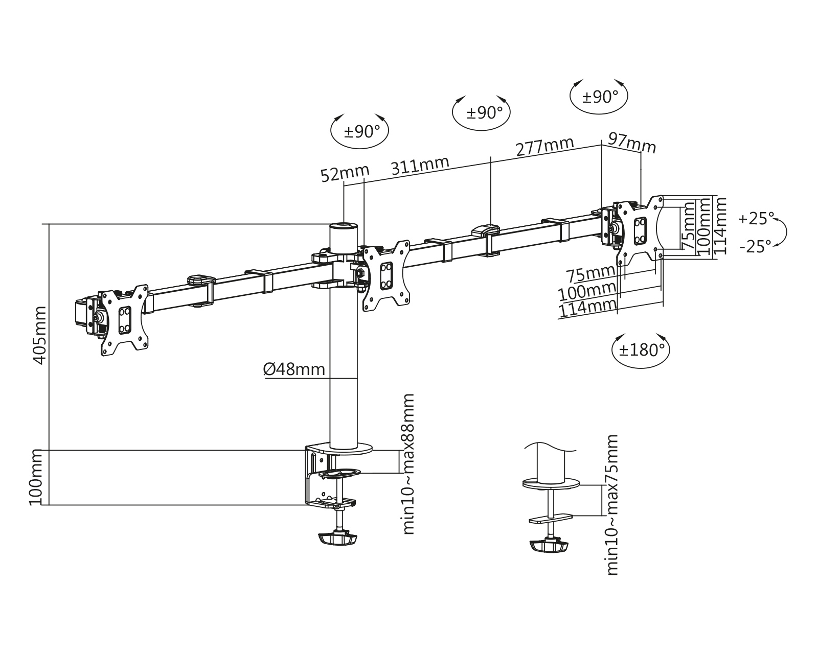 Bordille asennettava näyttöteline on MaxMountin ratkaisu, joka sallii jopa kolmen näytön kiinnittämisen enimmäispainolla 7 kg per näyttö. Se tarjoaa säädettävän korkeuden ja 360° käännettävän VESA-kiinnityksen, mikä tuo joustavuutta näytön sijoitteluun. Tuote on suunniteltu 17" ja 27" kokoisille näytöille, ja siinä on virtaviivainen kaapelinhallinta, joka pitää työskentelyalueen siistinä. Klemmin kiinnityksen asentaminen on helppoa, mikä helpottaa käyttöä.Näyttöteline on valmistettu teräksestä, mikä tarjoaa kestävyttä ja vakautta. Kallistussivun liikkuvuus mahdollistaa kallistuksen +25° - -25° välillä sekä 180° pyörimisen. Telineen mitat ovat 139,4 cm leveys, 16,7 cm syvyys ja 55,6 cm korkeus, joten se mahtuu useimpiin pöytiin ongelmitta. Asennustarvikkeet ja käyttöopas sisältyvät asennuksen helpottamiseksi.